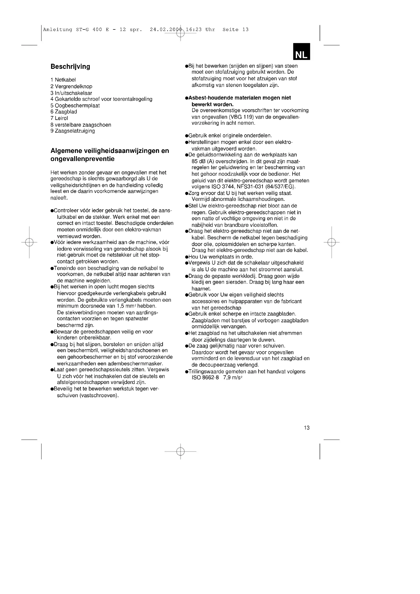 Anleitung ST-G 400 E - 12 spr. 24.02.2000 16:23 Uhr Seite 1213 Beschrijving 1 Netkabel 2 Vergrendelknop 3 In/uitschakelaar 4 Gekartelde schroef voor toerentalregeling 5 Oogbeschermplaat 6 Zaagblad 7 Leirol 8 verstelbare zaagschoen 9 Zaagselafzuiging Algemene veiligheidsaanwijzingen en ongevallenpreventie Het werken zonder gevaar en ongevallen met het gereedschap is slechts gewaarborgd als U de veiligsheidsrichtlijnen en de handleiding volledig leest en de daarin voorkomende aanwijzingen naleeft. Controleer vóór ieder gebruik het toestel, de aans- luitkabel en de stekker. Werk enkel met een correct en intact toestel. Beschadigde onderdelen moeten onmidellijk door een elektro-vakman vernieuwd worden. Vóór iedere werkzaamheid aan de machine, vóór iedere verwisseling van gereedschap alsook bij niet-gebruik moet de netstekker uit het stop- contact getrokken worden. Teneinde een beschadiging van de netkabel te voorkomen, de netkabel altijd naar achteren van de machine wegleiden. Bij het werken in open lucht mogen slechts hiervoor goedgekeurde verlengkabels gebruikt worden. De gebruikte verlengkabels moeten een minimum doorsnede van 1,5 mm