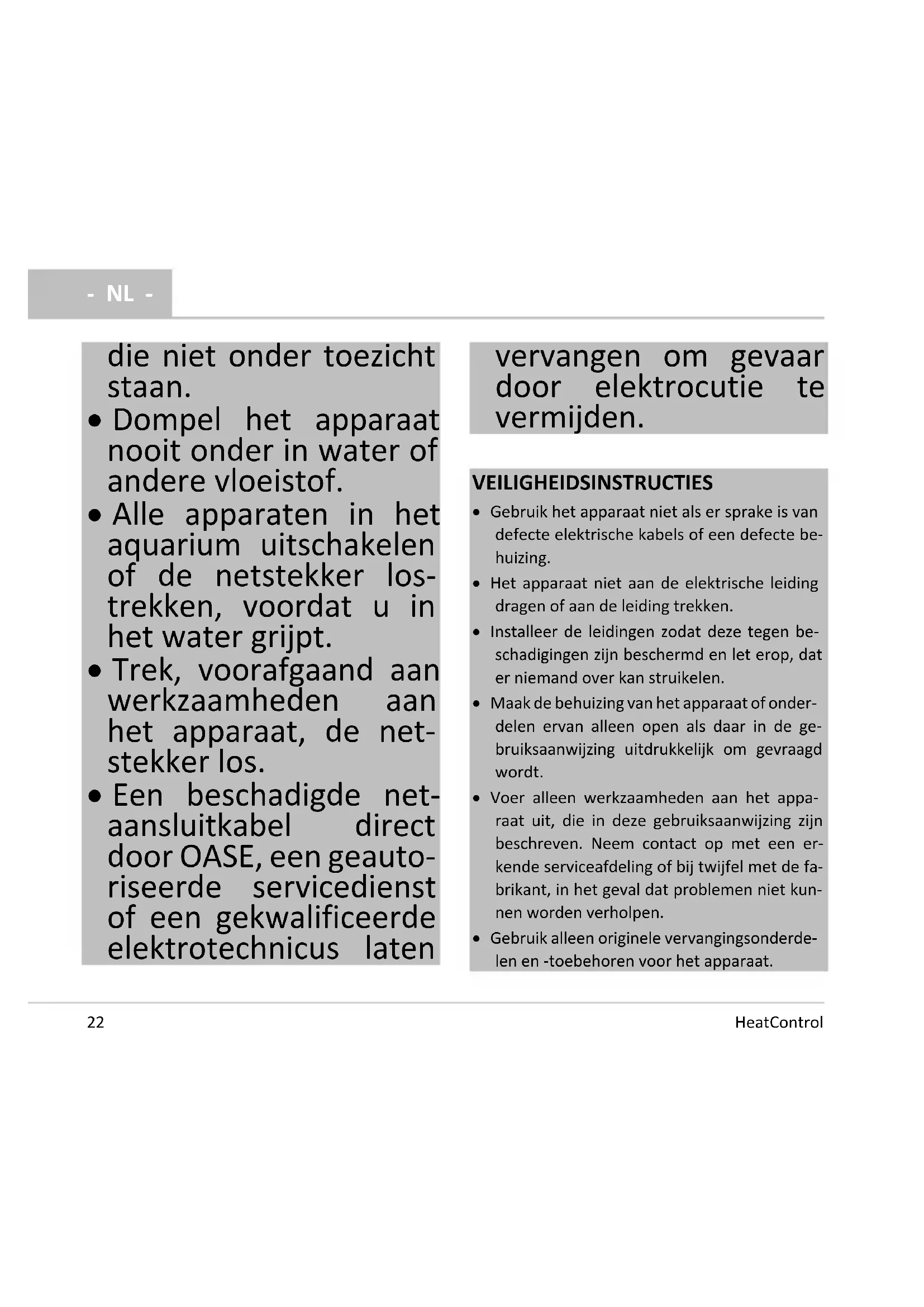 - Een beschadigde net- aansluitkabel direct door OASE, een geauto- riseerde servicedienst of een gekwalificeerde elektrotechnicus laten vervangen om gevaar door elektrocutie te vermijden. VEILIGHEIDSINSTRUCTIES