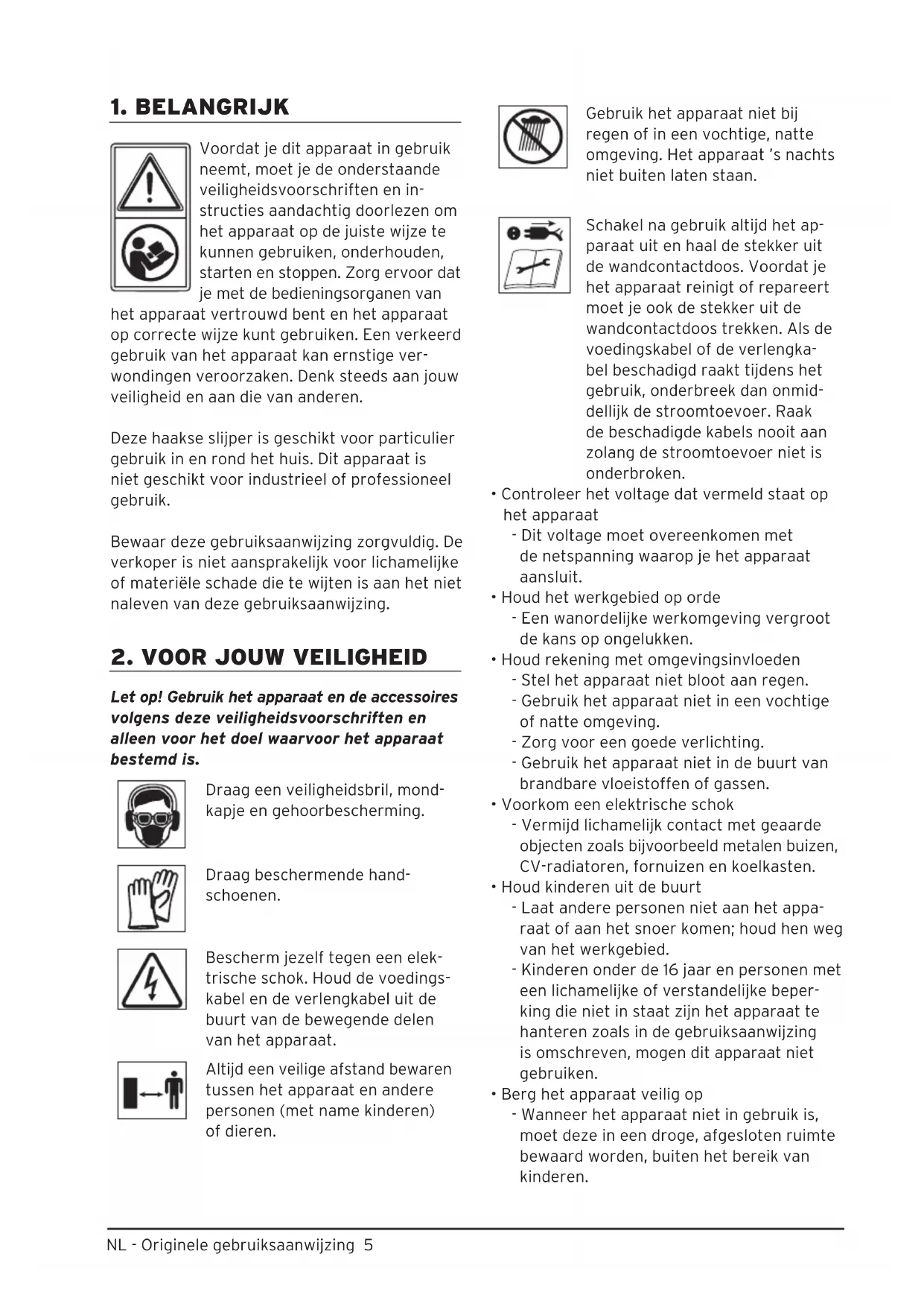Let op! Gebruik het apparaat en de accessoires volgens deze veiligheidsvoorschriften en alleen voor het doel waarvoor het apparaat bestemd is. Draag een veiligheidsbril, mond- kapje en gehoorbescherming. Draag beschermende hand- schoenen. Bescherm jezelf tegen een elek- trische schok. Houd de voedings- kabel en de verlengkabel uit de buurt van de bewegende delen van het apparaat. Altijd een veilige afstand bewaren tussen het apparaat en andere personen (met name kinderen) of dieren. Gebruik het apparaat niet bij regen of in een vochtige, natte omgeving. Het apparaat ’s nachts niet buiten laten staan. Schakel na gebruik altijd het ap- paraat uit en haal de stekker uit de wandcontactdoos. Voordat je het apparaat reinigt of repareert moet je ook de stekker uit de wandcontactdoos trekken. Als de voedingskabel of de verlengka- bel beschadigd raakt tijdens het gebruik, onderbreek dan onmid- dellijk de stroomtoevoer. Raak de beschadigde kabels nooit aan zolang de stroomtoevoer niet is onderbroken.