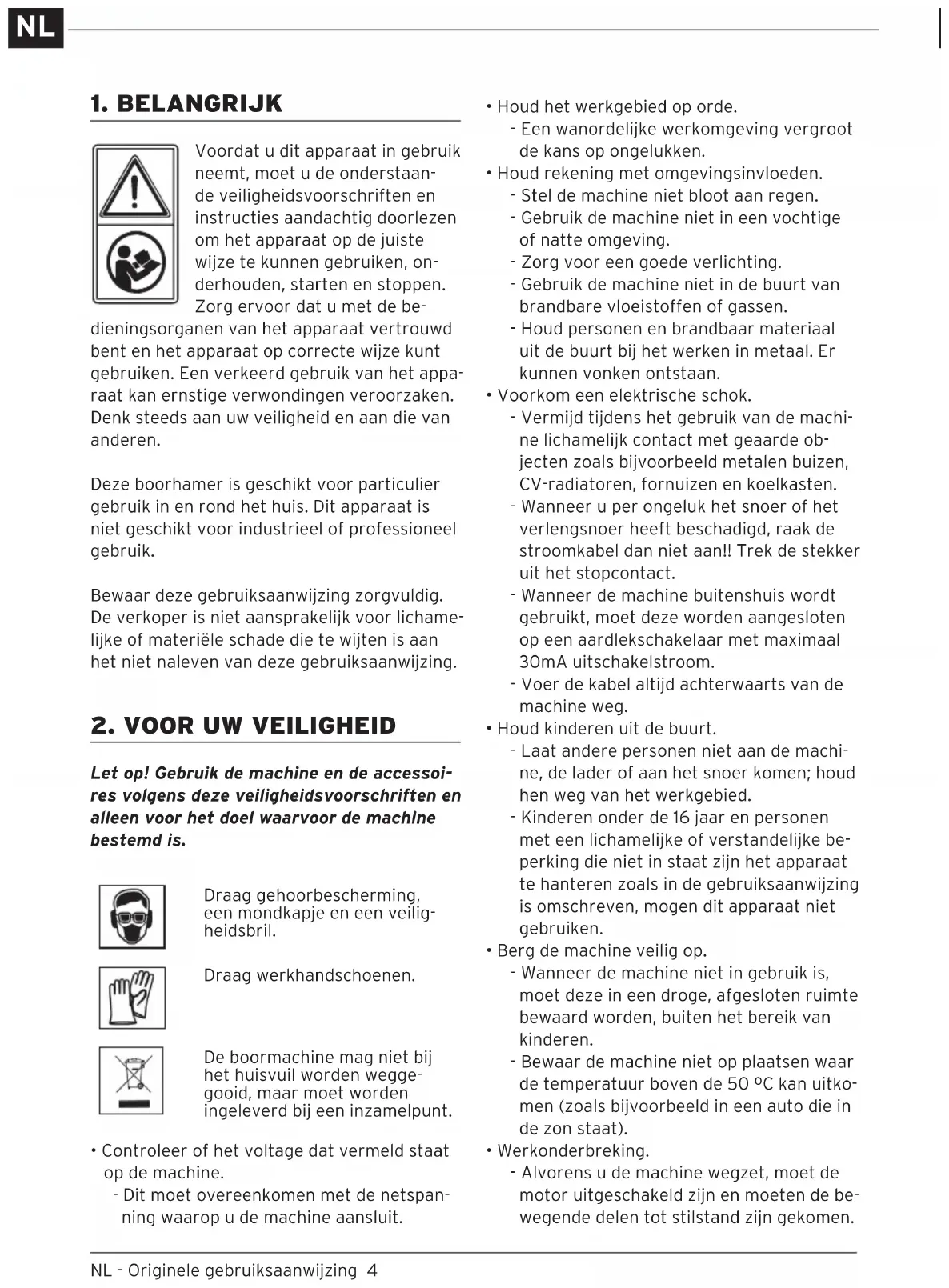 Let op! Gebruik de machine en de accessoi- res volgens deze veiligheidsvoorschriften en alleen voor het doel waarvoor de machine bestemd is. Draag gehoorbescherming, een mondkapje en een veilig- heidsbril. Draag werkhandschoenen. De boormachine mag niet bij het huisvuil worden wegge- gooid, maar moet worden ingeleverd bij een inzamelpunt.