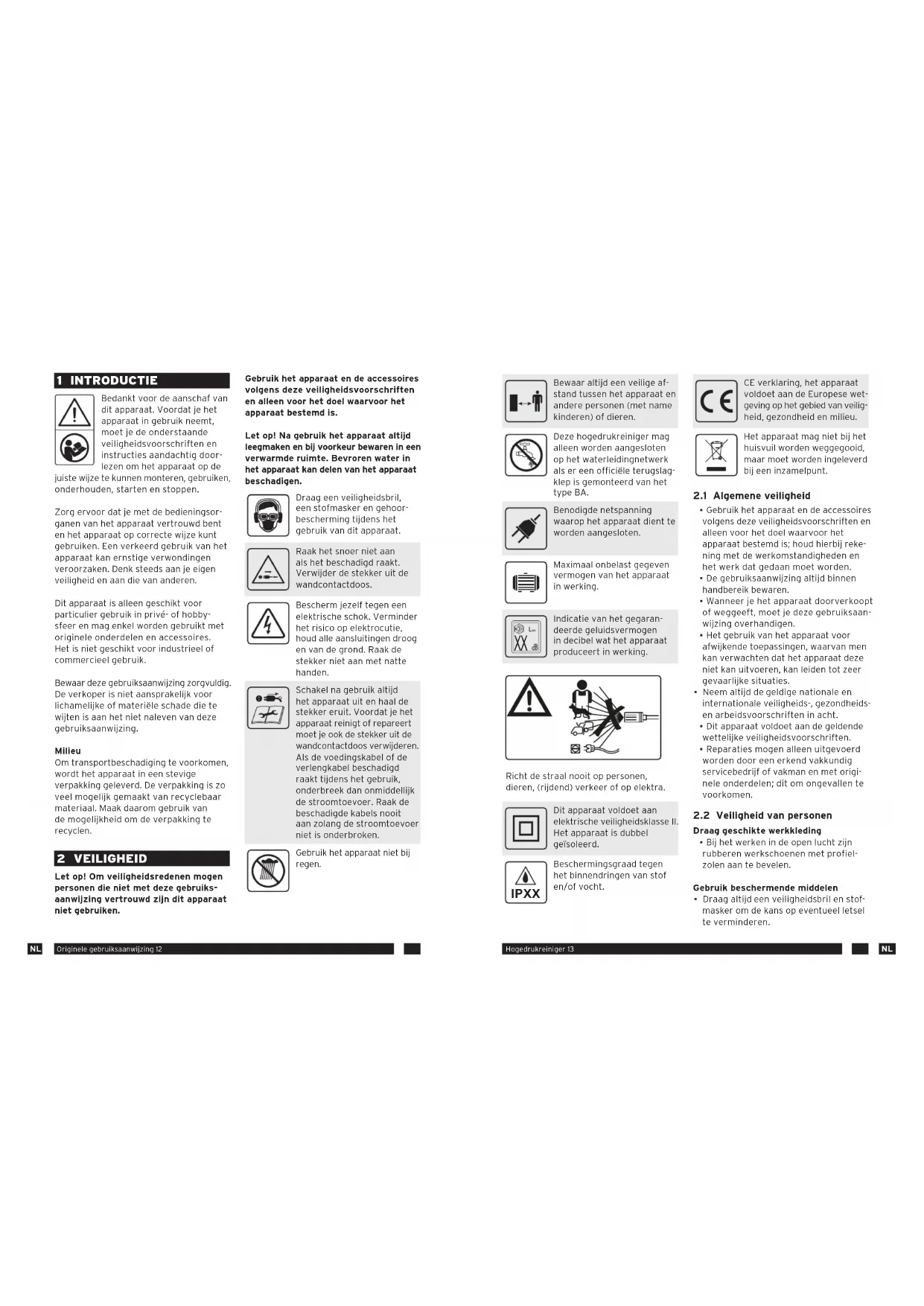 Indicatie van het gegaran- deerde geluidsvermogen in decibel wat het apparaat produceert in werking. Richt de straal nooit op personen, dieren, (rijdend) verkeer of op elektra. Dit apparaat voldoet aan elektrische veiligheidsklasse II. Het apparaat is dubbel geïsoleerd. IPXX Beschermingsgraad tegen het binnendringen van stof en/of vocht. CE verklaring, het apparaat voldoet aan de Europese wet- geving op het gebied van veilig- heid, gezondheid en milieu. Het apparaat mag niet bij het huisvuil worden weggegooid, maar moet worden ingeleverd bij een inzamelpunt.