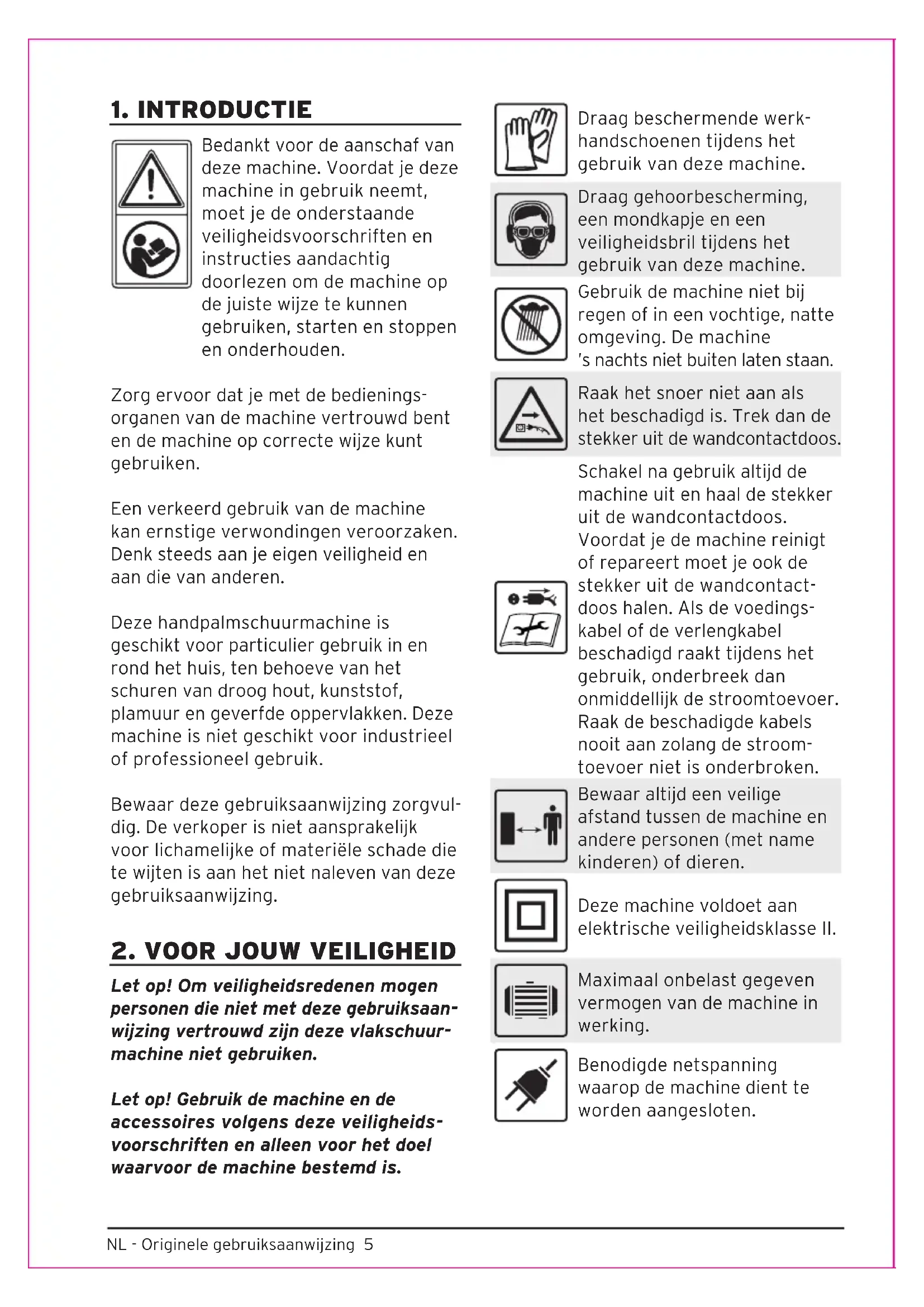 Let op! Om veiligheidsredenen mogen personen die niet met deze gebruiksaan- wijzing vertrouwd zijn deze vlakschuur- machine niet gebruiken. Let op! Gebruik de machine en de accessoires volgens deze veiligheids- voorschriften en alleen voor het doel waarvoor de machine bestemd is. Draag beschermende werk- handschoenen tijdens het gebruik van deze machine. Draag gehoorbescherming, een mondkapje en een veiligheidsbril tijdens het gebruik van deze machine. Gebruik de machine niet bij regen of in een vochtige, natte omgeving. De machine ’s nachts niet buiten laten staan. Raak het snoer niet aan als het beschadigd is. Trek dan de stekker uit de wandcontactdoos. Schakel na gebruik altijd de machine uit en haal de stekker uit de wandcontactdoos. Voordat je de machine reinigt of repareert moet je ook de stekker uit de wandcontact- doos halen. Als de voedings- kabel of de verlengkabel beschadigd raakt tijdens het gebruik, onderbreek dan onmiddellijk de stroomtoevoer. Raak de beschadigde kabels nooit aan zolang de stroom- toevoer niet is onderbroken. Bewaar altijd een veilige afstand tussen de machine en andere personen (met name kinderen) of dieren. Deze machine voldoet aan elektrische veiligheidsklasse II. Maximaal onbelast gegeven vermogen van de machine in werking. Benodigde netspanning waarop de machine dient te worden aangesloten. NL - Originele gebruiksaanwijzing 5CE verklaring, de machine voldoet aan de Europese wetgeving op het gebied van veiligheid, gezondheid en milieu. De machine mag niet bij het huisvuil worden weggegooid, maar moet worden ingeleverd bij een inzamelpunt.