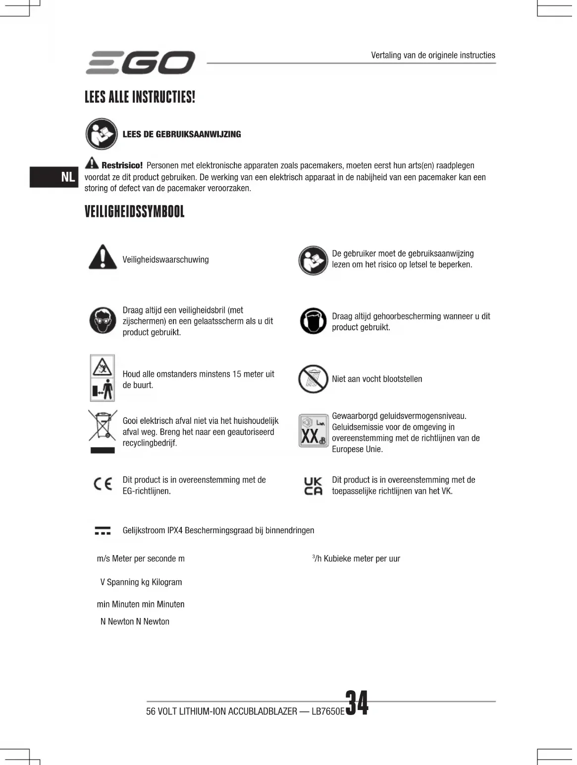 Gewaarborgd geluidsvermogensniveau. Geluidsemissie voor de omgeving in overeenstemming met de richtlijnen van de Europese Unie.Dit product is in overeenstemming met de EG-richtlijnen.Dit product is in overeenstemming met de toepasselijke richtlijnen van het VK.Gelijkstroom IPX4 Beschermingsgraad bij binnendringenm/s Meter per seconde m /h Kubieke meter per uurV Spanning kg Kilogrammin Minuten min MinutenN Newton N NewtonVertaling van de originele instructies56 VOLT LITHIUM-ION ACCUBLADBLAZER — LB7650E 35