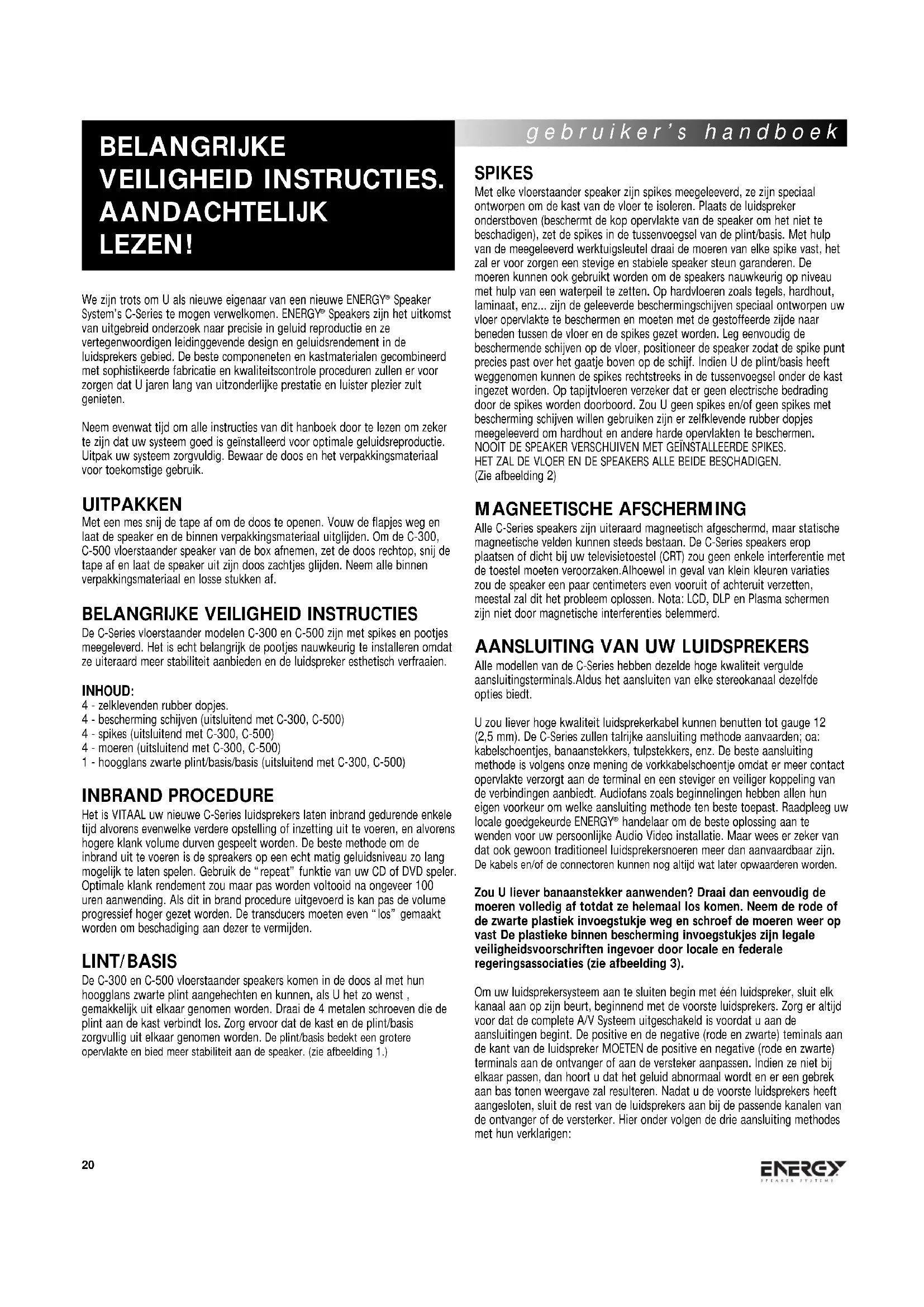 de speaker naar beneden in zijn plaats zachtjes glijden. FIJNE INSTELLING Voor dat men met de fijne instelling kan beginnen, moet men zeker zijn dat alle aansluitingen goed zijn gebonden en dat uw speakers hebben de kans naar inbrand gehad voor minstens 100 uren. Dit zal verzekeren echte gooie resultaten kunnen bereiken zijn. Uw luisterkamer is de laatste component van uw audiosysteem en het zal het verschil tussen mediocre weergave en optimale weergave zijn. Weerkaatsingen, die deel is van iedere opname en muziek weergave, zullen een belangrijk invloed op de resultaten en de rendement van uw systeem hebben. Indien uw luisterkamer schijnt te “levende” te zijn; zou het betekend dat er vele kale oppervlakten bestaan zoals glas vensters, hard bevloering en dunne stof, u zou dan misschien vinden het geluid overdreven gekleurt te zijn. Indien uw luisterkamer “dood” is, zou het betekend dat dik hoop tapijt, zwaar meubilair en veel muur bedekking zijn gebruikt, dan u zou misschien vinden dat de klank te weinig dynamische energie bevat. Om deze kwesties te verhelpen, kleine veranderingen aan uw luisterkamer zouden moeten beschouwd worden als dit in 't algemeen tot reuze verbeteringen in de klank kwaliteit leiden. Meeste luisterkamers moeten een evenwicht vinden tussen esthetiek en klank rendement. Maar geduld en nauwkeurige dagelijkse kleine regelingen in het plaatsen en de positie kunnen reusachtige akoestische dividenden betalen. De lager basfrequenties zijn typisch meest beïnvloede door uw luisterkamer configuratie. Indien u de basweergave in uw kamer vindt ongelijk of overdrijven in zekere frequenties te zijn, begin dan met herplaatsing van de voorste speakers ofwel draai hun oriëntatie in richting van de luisterende positie. (toeing) De nabijheid van de speakers met de kamer grenzen, zoals wanden zal ook de basfrequenties beïnvoeden. Indien u vindt uw systeem aan bas ontbreekt, controleer eerst alle aansluitingen om zeker te zijn uw systeem in fase is, dan experimenteer verder met herplaatsing. Hoe verder van de wanden, hoe minder bas weergave zal uw systeem hebben, maar dan zullen de bassen in 't algemeen beter gedefinieerd worden. Indien de speakers te dicht bij de kamer grens geplaats zijn, zal typisch de bas weergave overdreven en ziek gedefinieerde worden. De speakers aan de luisterkamer aanpassen zullen de beste resultaten genereren. Indien u verder problemen met beeldopbouw heeft, verzeker eerst dat alle speakers met elkaar in fase zijn. Indien dit het geval is en beeldopbouw is steeds een probleem dan probeer de speakers dichter bij elkaar te bewegen of toeing ze in een beetje (het naar binnen plaatsen van de luidspreker voeten) kan helpen in dit respect. Wanneer een surroundysteem word geinstaleerd, blijft alles bovenstaande beschrijving waar. Kalibratie van de speakers onderlinge afstanden, respons opstelling en geluidshoogte balanceren met behulp van een SPL meter (Sound Pressure Level), zijn noodzakelijk om het meeste uit uw systeem te onttrekken. SCHOONMAAK De C-Series luidspreker kasten moeten af en toe zachtjes afgestoft worden met enkel een vochtige pluisvrije doek en warm water om stof en vingerafdrukken te verwijderen. Gebruik geen schoonmaakmiddel, of schuurmiddel, of poetsmiddel bevattenden ammonia, en ook geen vensterpoetsmiddel. Om het stof van de grille te poetsen, gebruik maar de despassende borstel van een afzuiger of een eventjes bevochtigde spons of een pluisvrije doek. Raak nooit de speaker conus rechtstreeks aan. Laat de conus nooit in contact komen met water of reinigingsproducten, als dit onherstelbare schade kan veroorzaken. gebruiker’s handboekBem vindo ao Sistema de Alto-falantes ENERGY