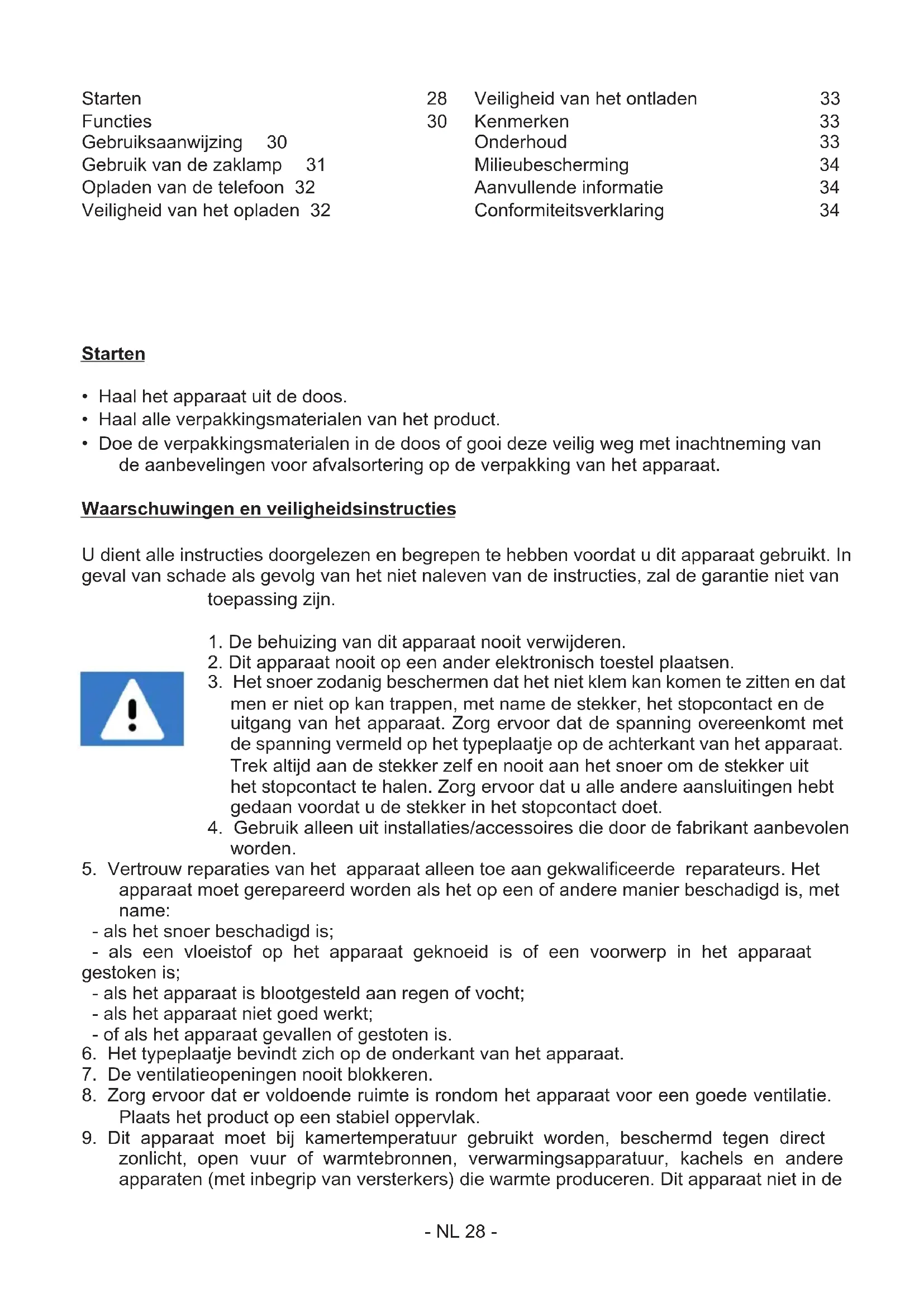 zonlicht, open vuur of warmtebronnen, verwarmingsapparatuur, kachels en andere apparaten (met inbegrip van vererkers) die warmte produceren. Dit apparaat niet in de Starten 28 Functies 30 Gebruiksaanwijzing 30 Gebruikvandezaklamp 31 Opladen van de telefoon 32 Veiligheid van het opladen 32 Veiligheid van het ontladen 33 Kenmerken 33 Onderhoud 33 Milieubescherming 34 Aanvullende informatie 34 Conformiteitsverklaring 34- NL 29 - buurt van warmtebronnen plaatsen.