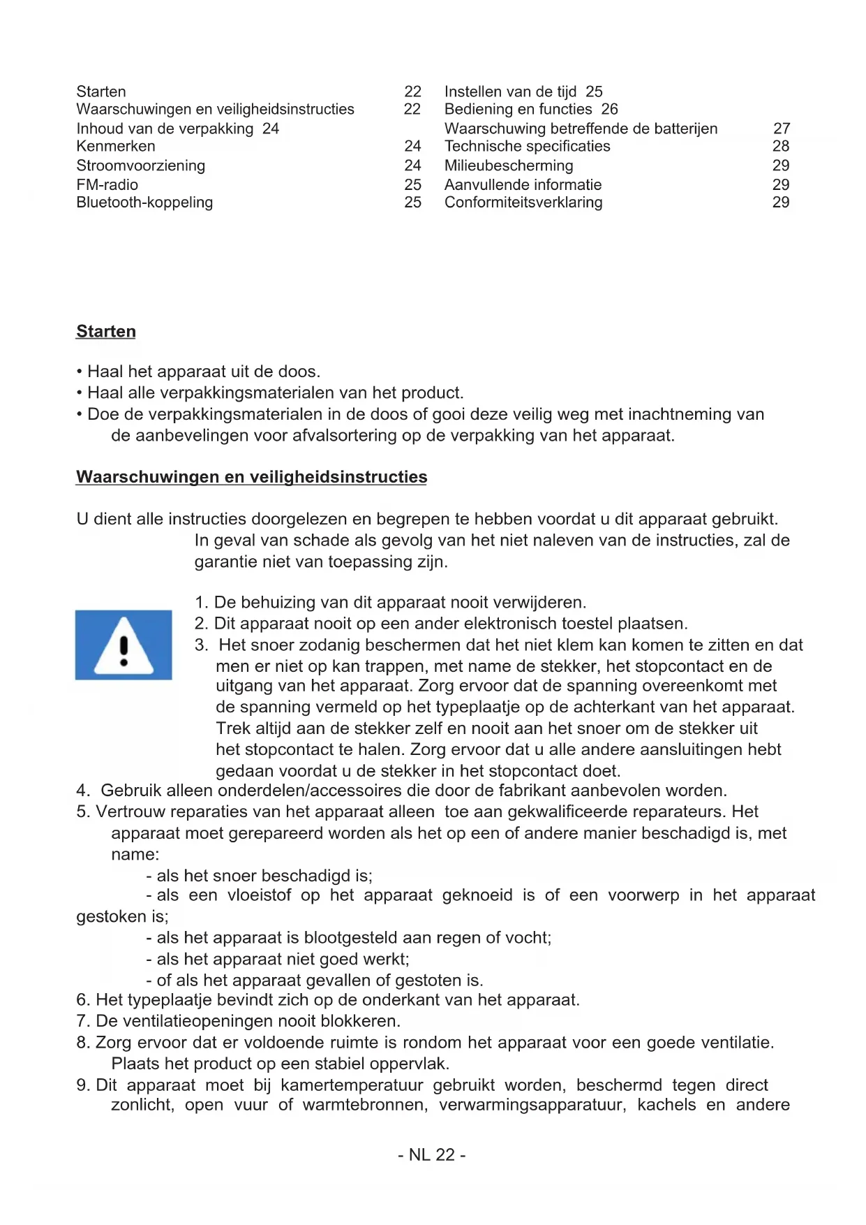 Inhoud van de verpakking 24 Kenmerken 24 Stroomvoorziening 24 FM-radio 25 Bluetooth-koppeling 25 Instellen van de tijd 25 Bediening en functies 26 Waarschuwing betreende de batterijen 27 Technische specicaties 28 Milieubescherming 29 Aanvullende informatie 29 Conformiteitsverklaring 29- NL 23 - apparaten (met inbegrip van vererkers) die warmte produceren. Dit apparaat niet in de buurt van warmtebronnen plaatsen.
