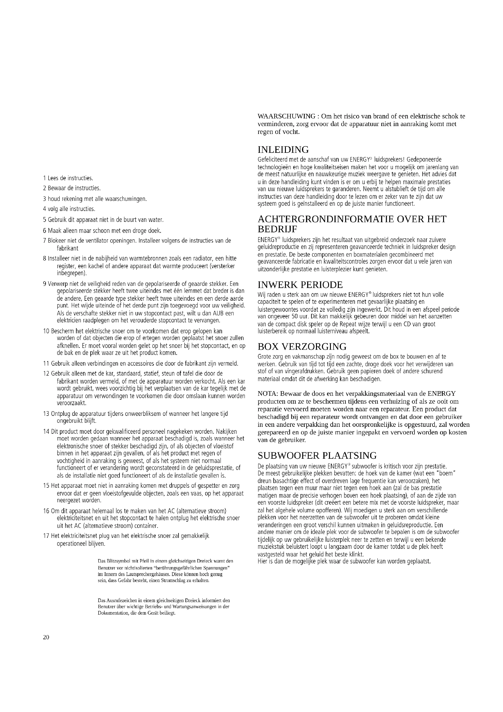 Se venligst garantibevisets bagside. bruger vejledning1 Lees de instructies. 2 Bewaar de instructies. 3 houd rekening met alle waarschuwingen. 4 volg alle instructies. 5 Gebruik dit apparaat niet in de buurt van water. 6 Maak alleen maar schoon met een droge doek. 7 Blokeer niet de ventilator openingen. Installeer volgens de instructies van de fabrikant 8 Installeer niet in de nabijheid van warmtebronnen zoals een radiator, een hitte register, een kachel of andere apparaat dat warmte produceert (versterker inbegrepen). 9 Verwerp niet de veiligheid reden van de gepolariseerde of geaarde stekker. Een gepolariseerde stekker heeft twee uiteindes met één lemmet dat breder is dan de andere, Een geaarde type stekker heeft twee uiteindes en een derde aarde punt. Het wijde uiteinde of het derde punt zijn toegevoegd voor uw veiligheid. Als de verschafte stekker niet in uw stopcontact past, wilt u dan AUB een elektricien raadplegen om het verouderde stopcontact te vervangen. 10 Bescherm het elektrische snoer om te voorkomen dat erop gelopen kan worden of dat objecten die erop of ertegen worden geplaatst het snoer zullen afknellen. Er moet vooral worden gelet op het snoer bij het stopcontact, en op de bak en de plek waar ze uit het product komen. 11 Gebruik alleen verbindingen en accessoires die door de fabrikant zijn vermeld. 12 Gebruik alleen met de kar, standaard, statief, steun of tafel die door de fabrikant worden vermeld, of met de apparatuur worden verkocht. Als een kar wordt gebruikt, wees voorzichtig bij het verplaatsen van de kar tegelijk met de apparatuur om verwondingen te voorkomen die door omslaan kunnen worden veroorzaakt. 13 Ontplug de apparatuur tijdens onweerbliksem of wanneer het langere tijd ongebruikt blijft. 14 Dit product moet door gekwalificeerd personeel nagekeken worden. Nakijken moet worden gedaan wanneer het apparaat beschadigd is, zoals wanneer het elektronische snoer of stekker beschadigd zijn, of als objecten of vloeistof binnen in het apparaat zijn gevallen, of als het product met regen of vochtigheid in aanraking is geweest, of als het systeem niet normaal functioneert of er verandering wordt geconstateerd in de geluidsprestatie, of als de installatie niet goed functioneert of als de installatie gevallen is. 15 Het apparaat moet niet in aanraking komen met druppels of gespetter en zorg ervoor dat er geen vloeistofgevulde objecten, zoals een vaas, op het apparaat neergezet worden. 16 Om dit apparaat helemaal los te maken van het AC (alternatieve stroom) elektriciteitsnet en uit het stopcontact te halen ontplug het elektrische snoer uit het AC (alternatieve stroom) container. 17 Het elektriciteitsnet plug van het elektrische snoer zal gemakkelijk operationeel blijven. WAARSCHUWING : Om het risico van brand of een elektrische schok te verminderen, zorg ervoor dat de apparatuur niet in aanraking komt met regen of vocht. INLEIDING Gefeliciteerd met de aanschaf van uw ENERGY