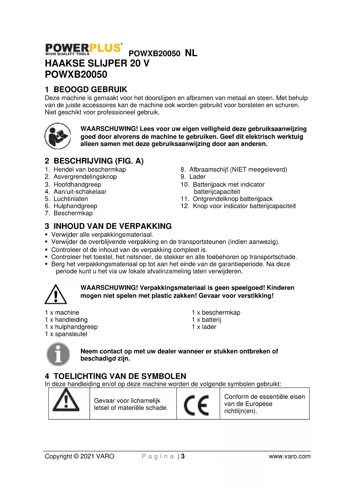 - Zorg ervoor dat bij het werken in een stoffige omgeving de ventilatieopeningen vrij gehouden worden.POWXB20050 NL Copyright © 2021 VARO P a g i n a | 7 www.varo.com