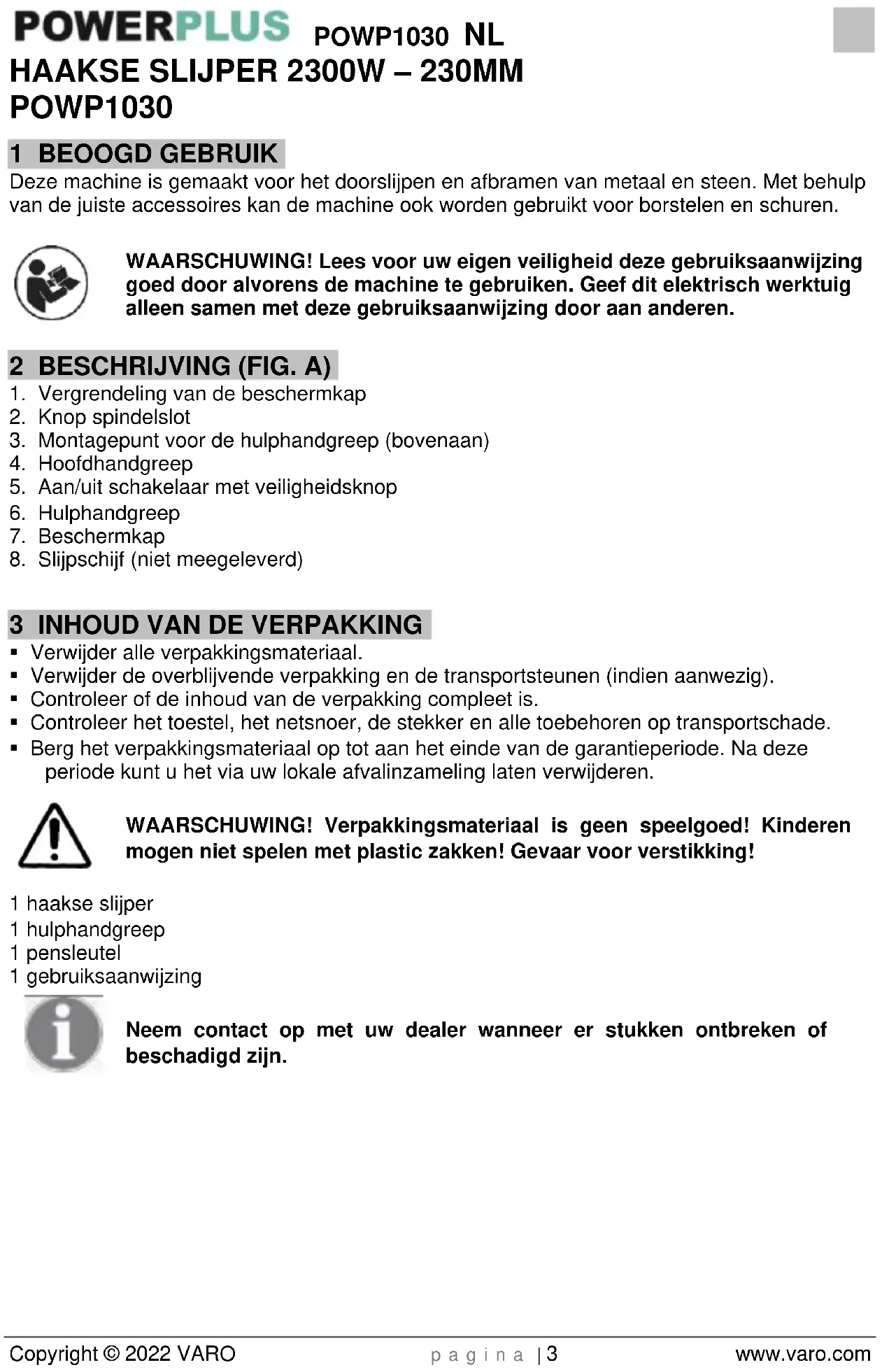 - Berg het verpakkingsmateriaal op tot aan het einde van de garantieperiode. Na deze periode kunt u het via uw lokale afvalinzameling laten verwijderen. WAARSCHUWING! Verpakkingsmateriaal is geen speelgoed! Kinderen mogen niet spelen met plastic zakken! Gevaar voor verstikking! 1 haakse slijper 1 hulphandgreep 1 pensleutel 1 gebruiksaanwijzing Neem contact op met uw dealer wanneer er stukken ontbreken of beschadigd zijn.POWP1030 NL Copyright © 2022 VARO p a g i n a | 4 www.varo.com