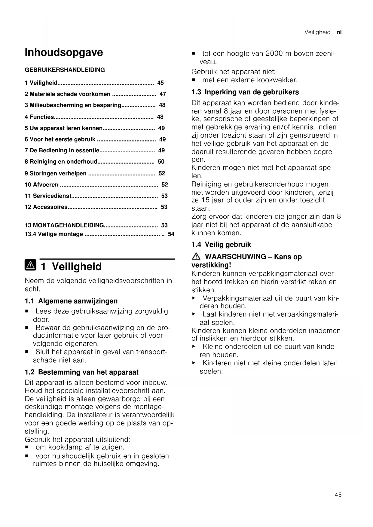 1 Veiligheid Neem de volgende veiligheidsvoorschriften in acht. 1.1 Algemene aanwijzingen ¡ Lees deze gebruiksaanwijzing zorgvuldig door. ¡ Bewaar de gebruiksaanwijzing en de pro- ductinformatie voor later gebruik of voor volgende eigenaren. ¡ Sluit het apparaat in geval van transport- schade niet aan. 1.2 Bestemming van het apparaat Dit apparaat is alleen bestemd voor inbouw. Houd het speciale installatievoorschrift aan. De veiligheid is alleen gewaarborgd bij een deskundige montage volgens de montage- handleiding. De installateur is verantwoordelijk voor een goede werking op de plaats van op- stelling. Gebruik het apparaat uitsluitend: ¡ om kookdamp af te zuigen. ¡ voor huishoudelijk gebruik en in gesloten ruimtes binnen de huiselijke omgeving. ¡ tot een hoogte van 2000m boven zeeni- veau. Gebruik het apparaat niet: ¡ met een externe kookwekker. 1.3 Inperking van de gebruikers Dit apparaat kan worden bediend door kinde- ren vanaf 8 jaar en door personen met fysie- ke, sensorische of geestelijke beperkingen of met gebrekkige ervaring en/of kennis, indien zij onder toezicht staan of zijn geïnstrueerd in het veilige gebruik van het apparaat en de daaruit resulterende gevaren hebben begre- pen. Kinderen mogen niet met het apparaat spe- len. Reiniging en gebruikersonderhoud mogen niet worden uitgevoerd door kinderen, tenzij ze 15jaar of ouder zijn en onder toezicht staan. Zorg ervoor dat kinderen die jonger zijn dan 8 jaar niet bij het apparaat of de aansluitkabel kunnen komen. 1.4 Veilig gebruik WAARSCHUWING‒Kans op verstikking! Kinderen kunnen verpakkingsmateriaal over het hoofd trekken en hierin verstrikt raken en stikken. ▶ Verpakkingsmateriaal uit de buurt van kin- deren houden. ▶ Laat kinderen niet met verpakkingsmateri- aal spelen. Kinderen kunnen kleine onderdelen inademen of inslikken en hierdoor stikken. ▶ Kleine onderdelen uit de buurt van kinde- ren houden. ▶ Kinderen niet met kleine onderdelen laten spelen.nl Veiligheid