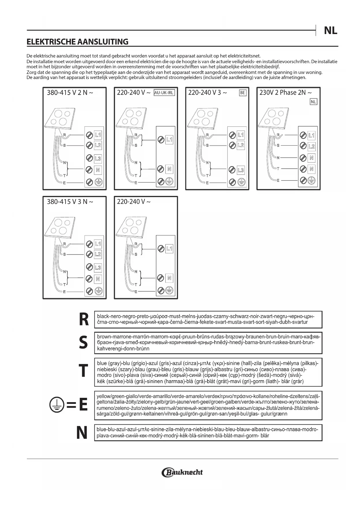 x4ELEKTRISCHE AANSLUITING De elektrische aansluiting moet tot stand gebracht worden voordat u het apparaat aansluit op het elektriciteitsnet. De installatie moet worden uitgevoerd door een erkend elektricien die op de hoogte is van de actuele veiligheids- en installatievoorschriften. De installatie moet in het bijzonder uitgevoerd worden in overeenstemming met de voorschriften van het plaatselijke elektriciteitsbedrijf. Zorg dat de spanning die op het typeplaatje aan de onderzijde van het apparaat wordt aangeduid, overeenkomt met de spanning in uw woning. De aarding van het apparaat is wettelijk verplicht: gebruik uitsluitend stroomgeleiders (inclusief de aardleiding) van de juiste afmetingen. blue-blu-azul-azul-μπλε-sinine-zila-mėlyna-niebieski-blau-bleu-blauw-albastru-синьо-плава-modro-plava-синий-синій-көк-modrý-modrý-kék-blå-sininen-blå-blåt-mavi-gorm- blár