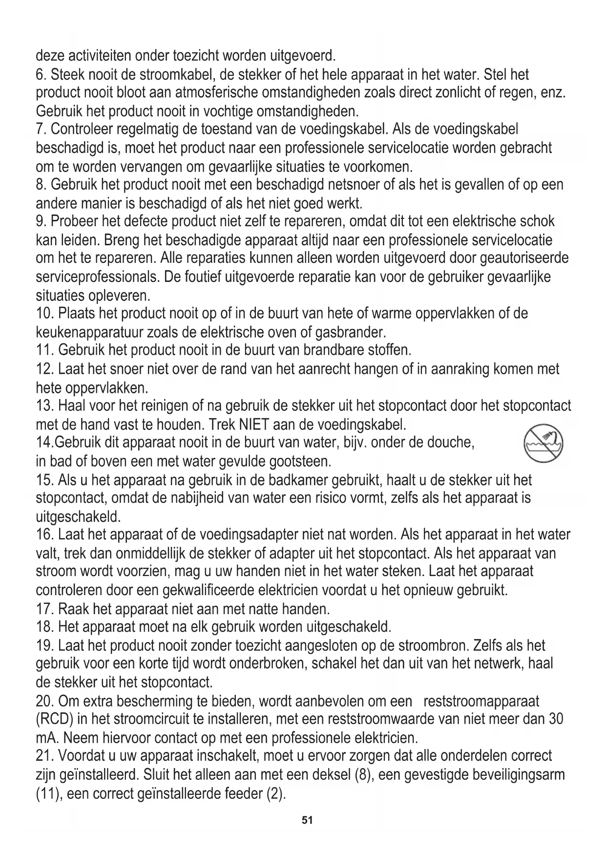 (RCD) in het stroomcircuit te installeren, met een reststroomwaarde van niet meer dan 30 mA. Neem hiervoor contact op met een professionele elektricien. 14.Gebruik dit apparaat nooit in de buurt van water, bijv. onder de douche,
