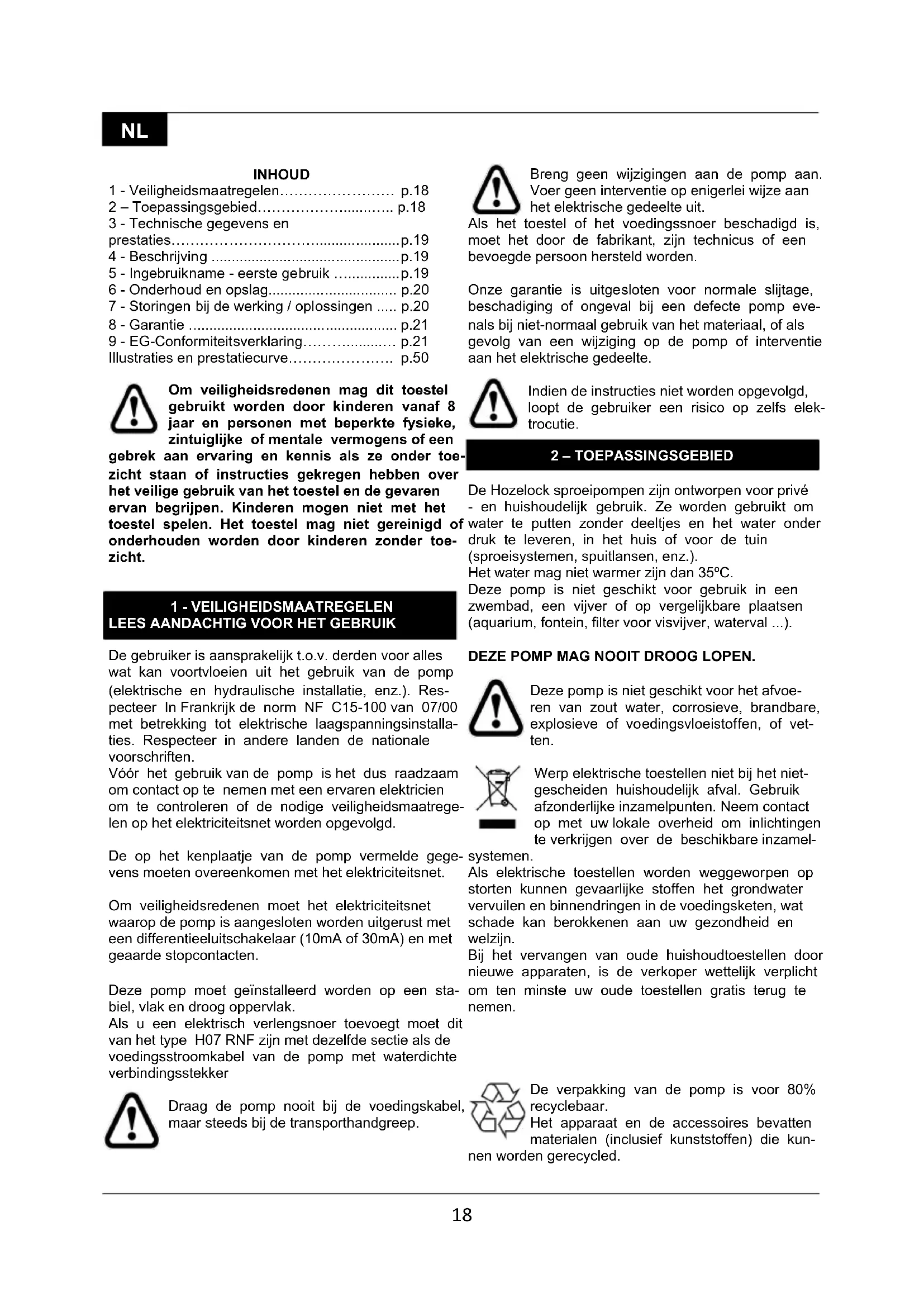 De gebruiker is aansprakelijk t.o.v. derden voor alles wat kan voortvloeien uit het gebruik van de pomp (elektrische en hydraulische installatie, enz.). Res- pecteer In Frankrijk de norm NF C15-100 van 07/00 met betrekking tot elektrische laagspanningsinstalla- ties. Respecteer in andere landen de nationale voorschriften. Vóór het gebruik van de pomp is het dus raadzaam om contact op te nemen met een ervaren elektricien om te controleren of de nodige veiligheidsmaatrege- len op het elektriciteitsnet worden opgevolgd. De op het kenplaatje van de pomp vermelde gege- vens moeten overeenkomen met het elektriciteitsnet. Om veiligheidsredenen moet het elektriciteitsnet waarop de pomp is aangesloten worden uitgerust met een differentieeluitschakelaar (10mA of 30mA) en met geaarde stopcontacten. Deze pomp moet geïnstalleerd worden op een sta- biel, vlak en droog oppervlak. Als u een elektrisch verlengsnoer toevoegt moet dit van het type H07 RNF zijn met dezelfde sectie als de voedingsstroomkabel van de pomp met waterdichte verbindingsstekker Draag de pomp nooit bij de voedingskabel, maar steeds bij de transporthandgreep. Breng geen wijzigingen aan de pomp aan. Voer geen interventie op enigerlei wijze aan het elektrische gedeelte uit. Als het toestel of het voedingssnoer beschadigd is, moet het door de fabrikant, zijn technicus of een bevoegde persoon hersteld worden. Onze garantie is uitgesloten voor normale slijtage, beschadiging of ongeval bij een defecte pomp eve- nals bij niet-normaal gebruik van het materiaal, of als gevolg van een wijziging op de pomp of interventie aan het elektrische gedeelte. Indien de instructies niet worden opgevolgd, loopt de gebruiker een risico op zelfs elek- trocutie. 2 – TOEPASSINGSGEBIED De Hozelock sproeipompen zijn ontworpen voor privé - en huishoudelijk gebruik. Ze worden gebruikt om water te putten zonder deeltjes en het water onder druk te leveren, in het huis of voor de tuin (sproeisystemen, spuitlansen, enz.). Het water mag niet warmer zijn dan 35ºC. Deze pomp is niet geschikt voor gebruik in een zwembad, een vijver of op vergelijkbare plaatsen (aquarium, fontein, filter voor visvijver, waterval ...). DEZE POMP MAG NOOIT DROOG LOPEN. Deze pomp is niet geschikt voor het afvoe- ren van zout water, corrosieve, brandbare, explosieve of voedingsvloeistoffen, of vet- ten. Werp elektrische toestellen niet bij het niet- gescheiden huishoudelijk afval. Gebruik afzonderlijke inzamelpunten. Neem contact op met uw lokale overheid om inlichtingen te verkrijgen over de beschikbare inzamel- systemen. Als elektrische toestellen worden weggeworpen op storten kunnen gevaarlijke stoffen het grondwater vervuilen en binnendringen in de voedingsketen, wat schade kan berokkenen aan uw gezondheid en welzijn. Bij het vervangen van oude huishoudtoestellen door nieuwe apparaten, is de verkoper wettelijk verplicht om ten minste uw oude toestellen gratis terug te nemen.