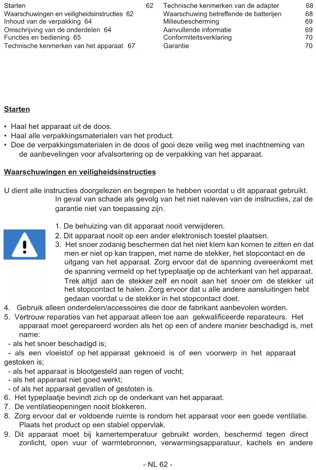 zonlicht, open vuur of warmtebronnen, verwarmingsapparatuur, kachels en andere Starten 62 Waarschuwingen en veiligheidsinstructies 62 Inhoud van de verpakking 64 Omschrijving van de onderdelen 64 Functies en bediening 65 Technische kenmerken van het apparaat