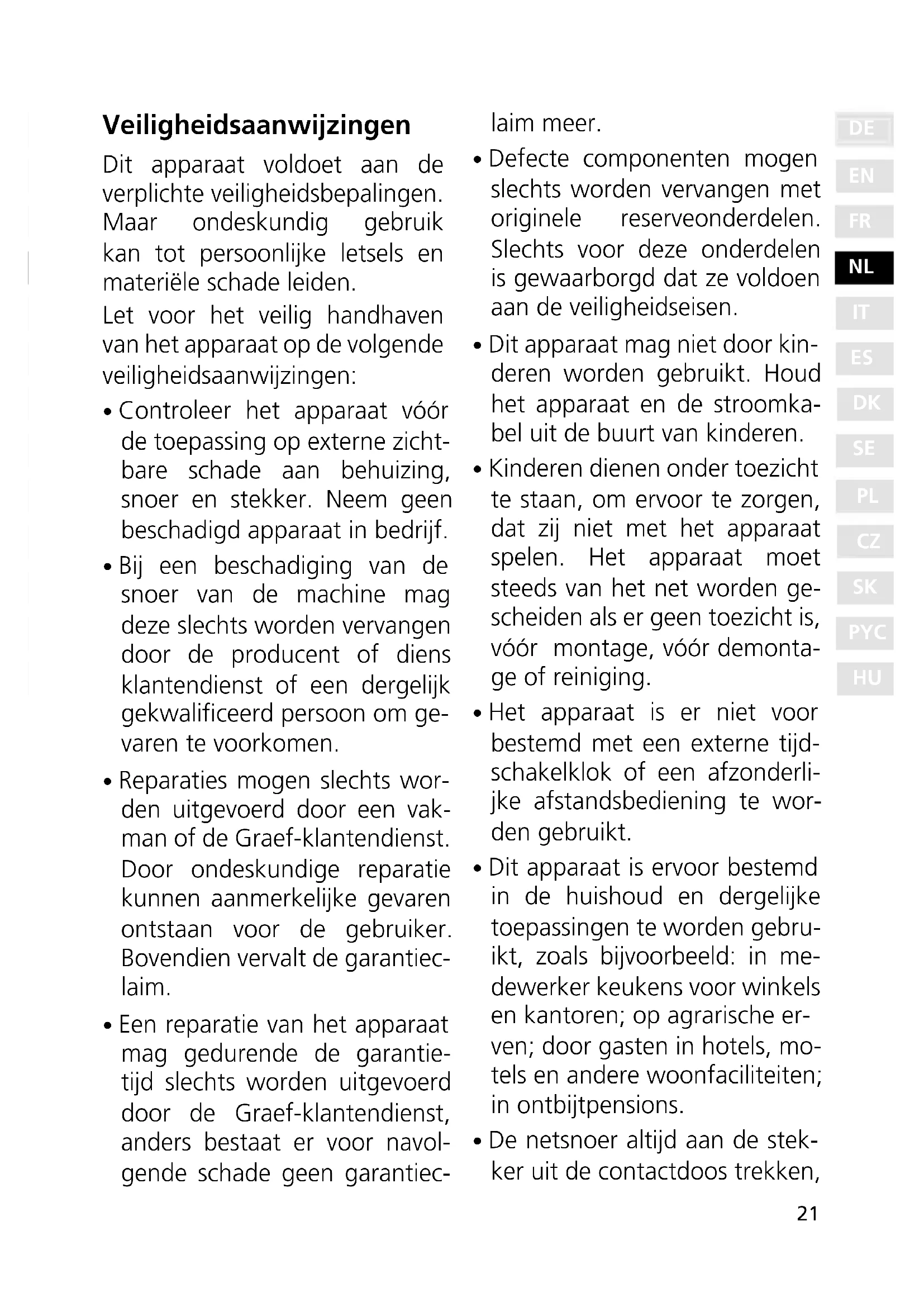 - Reparaties mogen slechts wor- den uitgevoerd door een vak- man of de Graef-klantendienst. Door ondeskundige reparatie kunnen aanmerkelijke gevaren ontstaan voor de gebruiker. Bovendien vervalt de garantiec- laim.