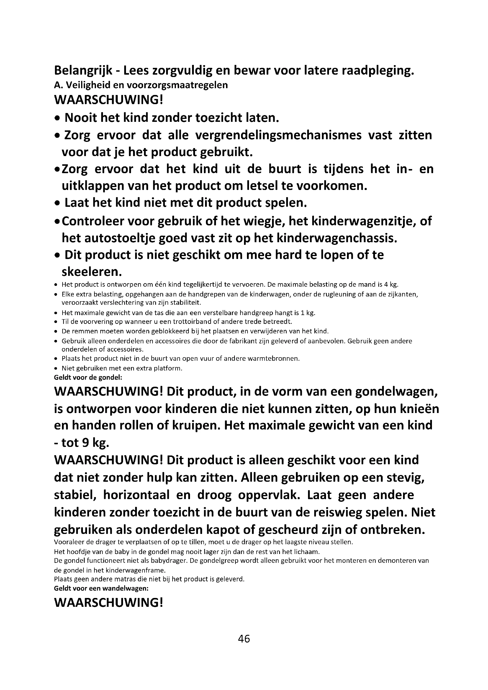 Tutti i diritti su questo documento appartengono interamente a 4Kraft Sp. z o.o. Qualsiasi uso non autorizzato contrario allo scopo previsto, in particolare: uso, copia, riproduzione, condivisione - in tutto o in parte senza il consenso di 4Kraft Sp. z o.o. può comportare conseguenze legali. Beste Klanten, Wij danken u voor de keuze van een Kinderkraft product Onze producten zijn ontworpen voor de veiligheid en het comfort van uw kind. De door ons aangeboden kinderwagen is een ideale oplossing voor personen die de kwaliteit, moderniteit en functionaliteit waarderen. Lees deze instructies aandachtig en volg alle aanbevelingen op.46 Belangrijk - Lees zorgvuldig en bewar voor latere raadpleging. A. Veiligheid en voorzorgsmaatregelen WAARSCHUWING!
