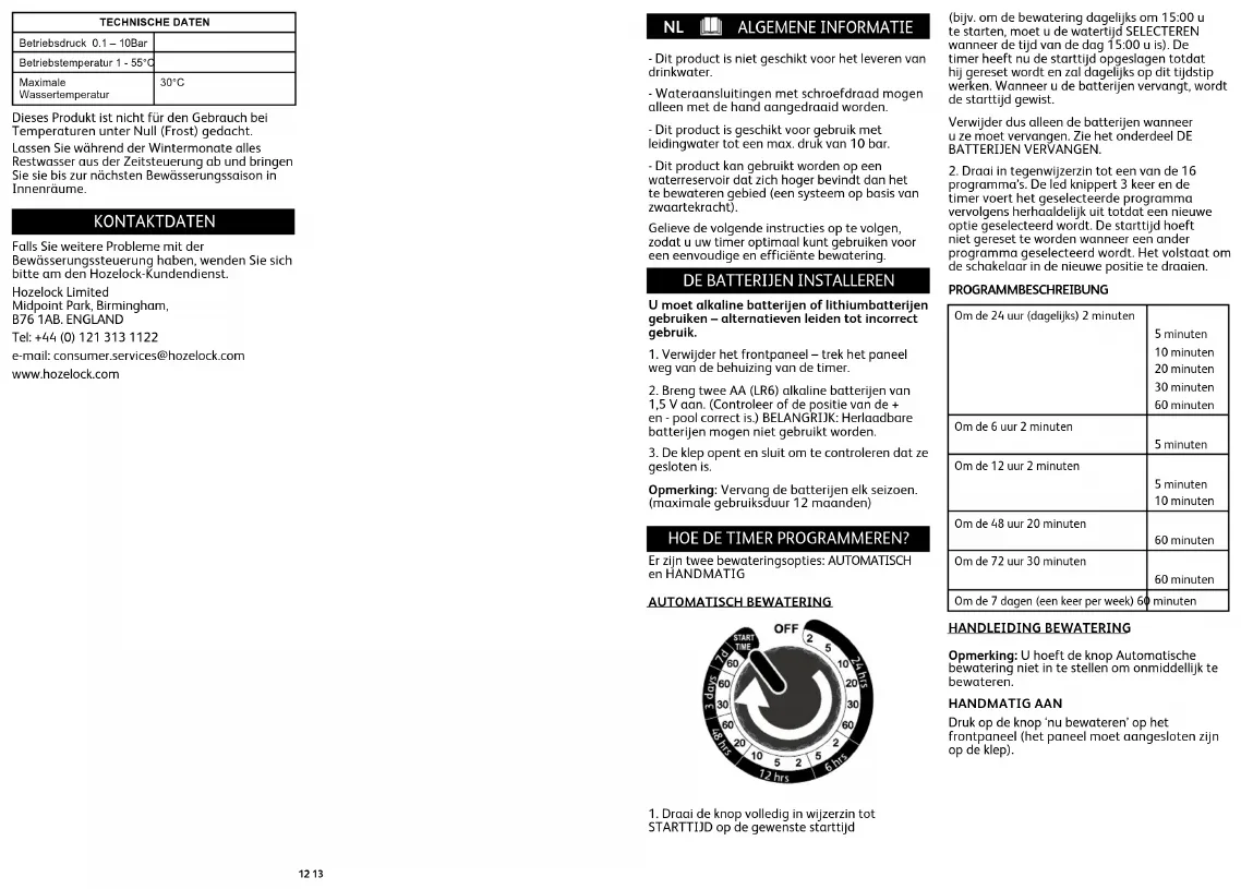 Bij het vervangen van de batterijen verwijdert u de oude batterijen en wacht u 20 seconden alvorens nieuwe batterijen aan te brengen. PROGRAMMASELECTIESTICKER Uw selectietimer is voorzien van stickers om u te helpen om de correcte programma’s te kiezen. Breng de sticker aan op de behuizing achter het frontpaneel, zoals PROBLEEMOPLOSSING PROBLEEM OPLOSSING Klep opent en sluit wanneer de batterijen geïnstalleerd worden, maar werkt daarna niet bij handmatig of automatisch bewateren. Uw selectietimer heeft een laag batterijvermogen gedetecteerd. Vervang ze door nieuwe batterijen. De led knippert rood Uw selectietimer heeft een laag batterijvermogen gedetecteerd. Vervang ze door nieuwe batterijen. Klep werkt, maar er stroomt geen water. Controleer of de kraan ingeschakeld is. Klep werkt handmatig, maar geen automatische bewatering. Stel de starttijd in zoals beschreven in het onderdeel Automatische Bewatering. Led knippert groen wanneer ik op de knop ‘nu bewateren’ druk, maar de klep werkt niet Controleer of het frontpaneel volledig aangebracht is in de behuizing. TECHNISCHE GEGEVENS Bedrijfsdruk 0.1 – 10 bar Bedrijfstemperatuur 1 - 55°C Maximale watertemperatuur 30°C Dit product is niet bedoeld om gebruikt te worden bij temperaturen onder nul (vorst) Tijdens de wintermaanden moet u eventueel resterend water uit uw timer verwijderen en de timer tot het volgende bewateringsseizoen binnenshuis bewaren. CONTACTGEGEVENS Mocht u nog vragen hebben over uw waterregelaar, gelieve dan contact op te nemen met de klantendienst van Hozelock. Hozelock Limited Midpoint Park, Birmingham,