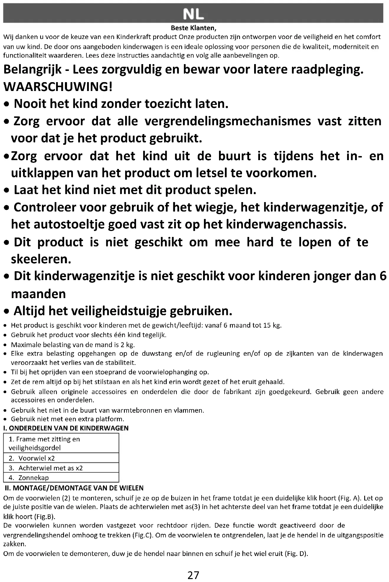 Beste Klanten, Wij danken u voor de keuze van een Kinderkraft product Onze producten zijn ontworpen voor de veiligheid en het comfort van uw kind. De door ons aangeboden kinderwagen is een ideale oplossing voor personen die de kwaliteit, moderniteit en functionaliteit waarderen. Lees deze instructies aandachtig en volg alle aanbevelingen op. Belangrijk - Lees zorgvuldig en bewar voor latere raadpleging. WAARSCHUWING!