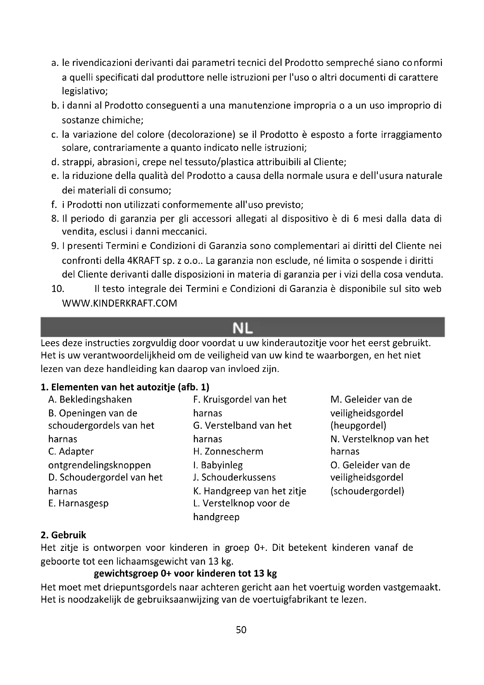 Neem een paar minuten de tijd om deze gebruiksaanwijzing te lezen om de veiligheid van uw kind te waarborgen. Veel vermijdbare verwondingen worden veroorzaakt door roekeloos en oneigenlijk gebruik van het zitje. ● Gebruik het zitje alleen achterwaarts gericht en installeer het met 3-punts veiligheidsgordels met oprolmechanisme. ● Plaats het kinderzitje NIET op zitplaatsen die zijn uitgerust met een actieve airbag voorin, omdat dit gevaarlijk kan zijn. Dit geldt niet voor zij-airbags. ● Als u het kinderzitje op de voorzitplaats monteert, moet de airbag worden uitgeschakeld. Het is aan te raden om het zitje alleen op de achterbank van de auto te monteren. Voor instructies over de geschiktheid van een zitplaats voor gebruik met een kinderzitje, zie het handboek van de auto. ● Het is alleen geschikt voor installatie als de goedgekeurde voertuigen zijn uitgerust met driepuntsveiligheidsgordels met oprolmechanisme die zijn goedgekeurd volgens VN/ECE-Reglement nr. 16 of andere gelijkwaardige normen. ● Vergeet niet dat de gordels die het zitje aan de auto bevestigen, strak moeten zitten; de gordels van het kinderzitje moeten passen bij de lichaamsbouw van uw kind en de gordel(s) mag (mogen) niet verdraaid zijn. ● Het zitje dient te worden vervangen als deze tijdens een verkeersongeluk aan zware belastingen onderhevig is geweest. ● Het zitje mag op geen enkele wijze gemodificeerd worden. ● Bescherm het kinderzitje tegen directe blootstelling aan zonlicht, anders kunnen de verwarmde onderdelen uw kind branden. ● Laat uw kind nooit zonder toezicht in het zitje achter. ● Zorg ervoor dat uw bagage en andere voorwerpen voldoende beveiligd zijn, vooral op de plank onder de achterruit, omdat ze bij een botsing letsel kunnen veroorzaken. ● Het zitje mag niet zonder bekleding gebruikt worden. ● Gebruik geen andere dan de door de fabrikant aanbevolen vervangende bekleding, omdat deze een integraal onderdeel is van het veiligheidssysteem van het zitje. ● Het wordt aanbevolen om de gebruiksaanwijzing te bewaren voor de gehele gebruiksduur van het zitje. ● Gebruik geen andere bevestigingspunten dan die welke in de gebruiksaanwijzing staan beschreven en op het kinderzitje zijn gemarkeerd. ● Alle harde onderdelen en kunststoffen van het kinderzitje moeten zodanig worden geplaatst en geïnstalleerd dat ze bij normaal gebruik niet bekneld kunnen raken door een schuifzitplaats of - deur van het voertuig. ● Controleer regelmatig de technische staat van de veiligheidsharnas en let daarbij vooral op de bevestigingspunten, de hechtingen en verstelelementen. ● Stop met het gebruik van het zitje als de onderdelen ervan beschadigd of loszitten. ● In noodgevallen is het belangrijk om de veiligheidsgordels snel los te maken. Dit betekent dat de ontgrendelingsknop van het harnas niet volledig is vergrendeld, zorg dus ervoor dat uw kind niet met de gesp speelt.52 ● Zorg ervoor dat de gordel in de geleiding goed geleid wordt. De gesp van de veiligheidsgordel moet zich onder de gordelgeleider (afb. 1 M) bevinden. ● Geef uw kind een goed voorbeeld en klem altijd de gordel vast. Een volwassene die geen veiligheidsgordel draagt, kan ook een risico voor het kind vormen. ● Zorg ervoor dat het zitje voor elke rit in de auto goed vastzit. ● Het zitje moet ook worden vastgezet als het niet in gebruik is. Als het zitje niet wordt vastgezet, kan dit zelfs bij een noodremming tot verwondingen bij de passagiers leiden. ● Let op! Plaats het zitje niet op een verhoging, zoals een tafel, tafelblad, bed, etc., omdat dit tot valgevaar kan leiden. BELANGRIJK! BEWAAR HET VOOR TOEKOMSTIGE REFERENTIE. Gebruik van het zitje als kinderbedje (norm EN 12790:2009) WAARSCHUWING!: ● Laat uw kind nooit zonder toezicht achter. ● Gebruik het product niet als uw kind op zichzelf kan zitten. ● Het product is niet ontworpen voor lange slaapperiodes. ● Gebruik dit product nooit op een verhoogd oppervlak (bijvoorbeeld een tafel). Valgevaar. ● Gebruik altijd het bevestigingssysteem (harnas). ● Dit product vervangt geen kinderbed of bed. Als uw kind moet slapen, moet het in een geschikt kinderbedje of bed geplaatst worden. ● Gebruik het product niet als er onderdelen beschadigd zijn of ontbreken. ● Gebruik geen andere toebehoren of reserveonderdelen dan die welke door de fabrikant worden aanbevolen.
