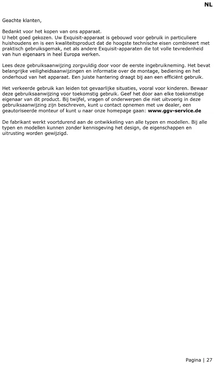 - Après réparation de l’appareil, les factures de réparation sont dues immédiatement et doivent être réglées sans déduction.NL Pagina | 27 Geachte klanten, Bedankt voor het kopen van ons apparaat. U hebt goed gekozen. Uw Exquisit-apparaat is gebouwd voor gebruik in particuliere huishoudens en is een kwaliteitsproduct dat de hoogste technische eisen combineert met praktisch gebruiksgemak, net als andere Exquisit-apparaten die tot volle tevredenheid van hun eigenaars in heel Europa werken. Lees deze gebruiksaanwijzing zorgvuldig door voor de eerste ingebruikneming. Het bevat belangrijke veiligheidsaanwijzingen en informatie over de montage, bediening en het onderhoud van het apparaat. Een juiste hantering draagt bij aan een efficiënt gebruik. Het verkeerde gebruik kan leiden tot gevaarlijke situaties, vooral voor kinderen. Bewaar deze gebruiksaanwijzing voor toekomstig gebruik. Geef het door aan elke toekomstige eigenaar van dit product. Bij twijfel, vragen of onderwerpen die niet uitvoerig in deze gebruiksaanwijzing zijn beschreven, kunt u contact opnemen met uw dealer, een geautoriseerde monteur of kunt u naar onze homepage gaan: www.ggv-service.de De fabrikant werkt voortdurend aan de ontwikkeling van alle typen en modellen. Bij alle typen en modellen kunnen zonder kennisgeving het design, de eigenschappen en uitrusting worden gewijzigd.NL Pagina | 28 19 Veiligheid