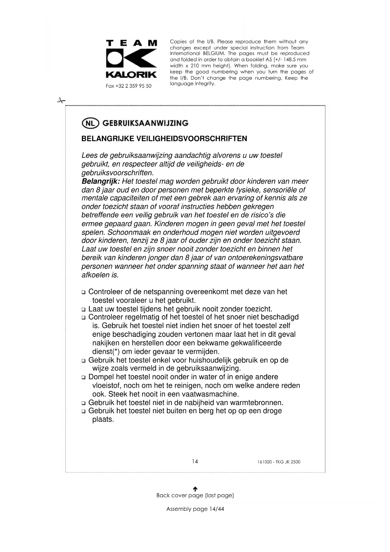 BELANGRIJKE VEILIGHEIDSVOORSCHRIFTEN Lees de gebruiksaanwijzing aandachtig alvorens u uw toestel gebruikt, en respecteer altijd de veiligheids- en de gebruiksvoorschriften. Belangrijk: Het toestel mag worden gebruikt door kinderen van meer dan 8 jaar oud en door personen met beperkte fysieke, sensoriële of mentale capaciteiten of met een gebrek aan ervaring of kennis als ze onder toezicht staan of vooraf instructies hebben gekregen betreffende een veilig gebruik van het toestel en de risico’s die ermee gepaard gaan. Kinderen mogen in geen geval met het toestel spelen. Schoonmaak en onderhoud mogen niet worden uitgevoerd door kinderen, tenzij ze 8 jaar of ouder zijn en onder toezicht staan. Laat uw toestel en zijn snoer nooit zonder toezicht en binnen het bereik van kinderen jonger dan 8 jaar of van ontoerekeningsvatbare personen wanneer het onder spanning staat of wanneer het aan het afkoelen is. Controleer of de netspanning overeenkomt met deze van het toestel vooraleer u het gebruikt. Laat uw toestel tijdens het gebruik nooit zonder toezicht. Controleer regelmatig of het toestel of het snoer niet beschadigd is. Gebruik het toestel niet indien het snoer of het toestel zelf enige beschadiging zouden vertonen maar laat het in dit geval nakijken en herstellen door een bekwame gekwalificeerde dienst(*) om ieder gevaar te vermijden. Gebruik het toestel enkel voor huishoudelijk gebruik en op de wijze zoals vermeld in de gebruiksaanwijzing. Dompel het toestel nooit onder in water of in enige andere vloeistof, noch om het te reinigen, noch om welke andere reden ook. Steek het nooit in een vaatwasmachine. Gebruik het toestel niet in de nabijheid van warmtebronnen. Gebruik het toestel niet buiten en berg het op op een droge plaats. Copies of the I/B. Please reproduce them without any changes except under special instruction from Team International BELGIUM. The pages must be reproduced and folded in order to obtain a booklet A5 (+/- 148.5 mm width x 210 mm height). When folding, make sure you keep the good numbering when you turn the pages of the I/B. Don’t change the page numbering. Keep the language integrity.