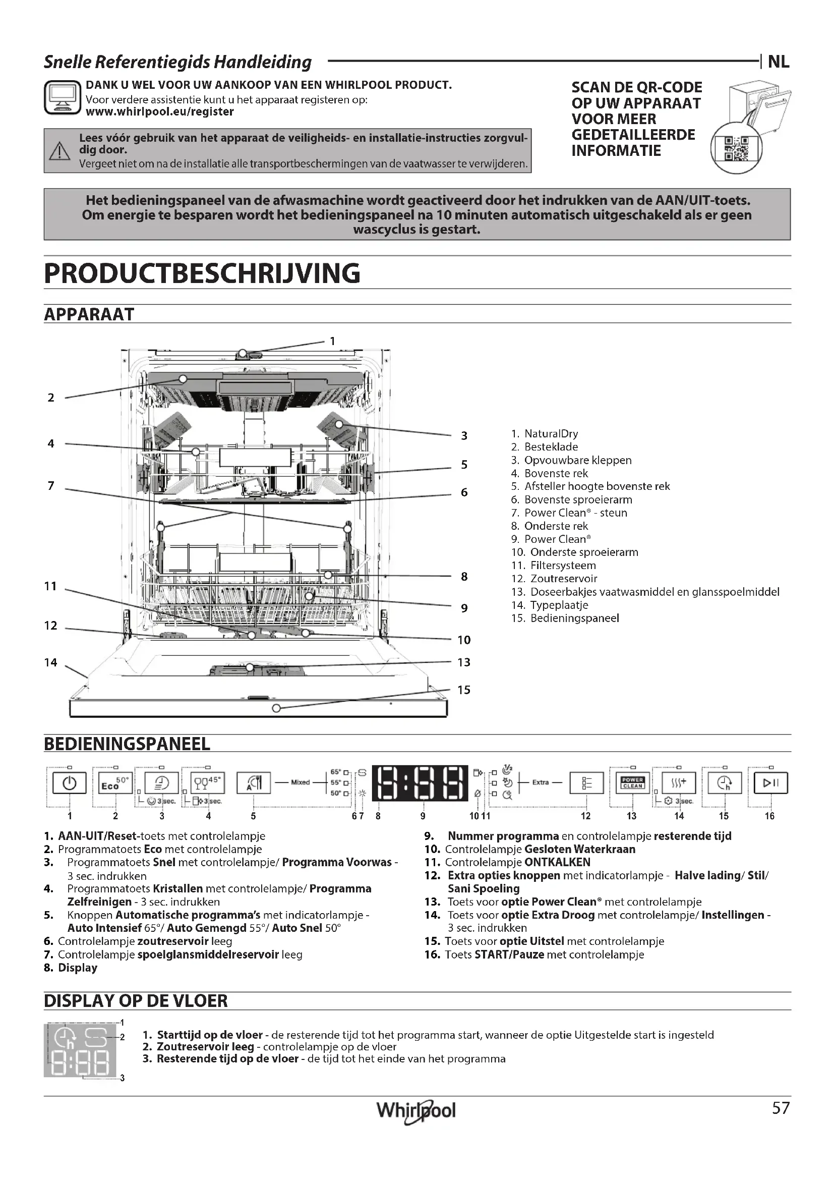 VOOR MEER GEDETAILLEERDE INFORMATIE BEDIENINGSPANEEL PRODUCTBESCHRIJVING Het bedieningspaneel van de afwasmachine wordt geactiveerd door het indrukken van de AAN/UIT-toets. Om energie te besparen wordt het bedieningspaneel na 10 minuten automatisch uitgeschakeld als er geen wascyclus is gestart. APPARAAT 1. NaturalDry2. Besteklade3. Opvouwbare kleppen4. Bovenste rek5. Afsteller hoogte bovenste rek6. Bovenste sproeierarm7. Power Clean® - steun8. Onderste rek9. Power Clean®10. Onderste sproeierarm11. Filtersysteem12. Zoutreservoir13. Doseerbakjes vaatwasmiddel en glansspoelmiddel14. Typeplaatje15. Bedieningspaneel