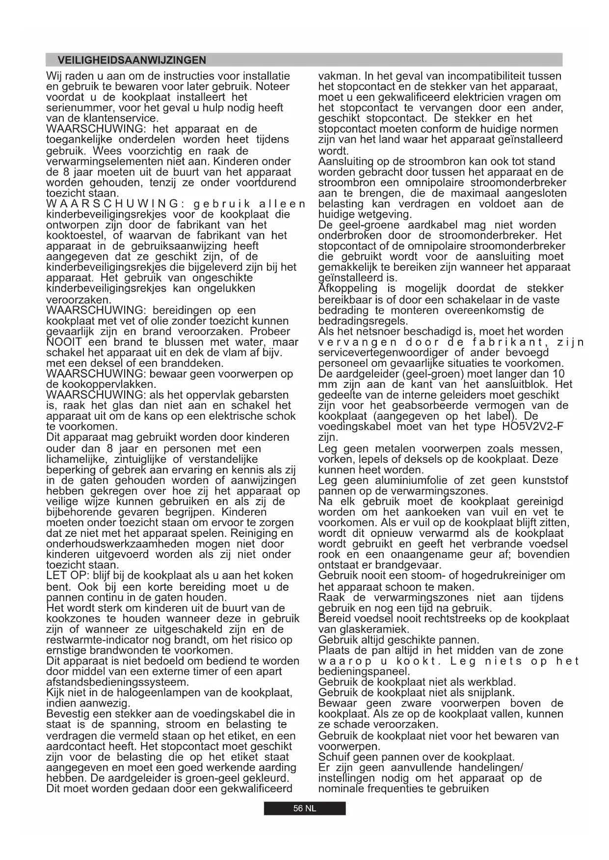 Dit apparaat is ontwikkeld en geproduceerd voor koken bij huishoudelijk gebruik. Elke andere vorm van gebruik is onjuist en derhalve gevaarlijk. De fabrikant kan niet aansprakelijk worden gesteld voor eventuele schade veroorzaakt door onjuist, onredelijk en onverantwoord gebruik. Kinderen jonger dan 8 jaar moeten op veilige afstand worden gehouden, tenzij continu bewaakt. Dit apparaat is niet bedoeld voor gebruik door personen (inclusief kinderen) met een lichamelijke, zintuiglijke of verstandelijke handicap of met een gebrek aan ervaring en kennis, tenzij ze zijn opgeleid en begeleid in het gebruik van het apparaat door een persoon die verantwoordelijk is voor hun veiligheid. Bij het koken met vet of olie, loop niet weg van de kookplaat. Oververhitte vetten of oliën kunnen snel ontbranden. Probeer nooit een brand met water te blussen, maar schakel eerst het toestel uit en bedek de vlam met een deksel of een branddeken. Tijdens de werking van de kookplaat, kunnen bereikbare delen zeer heet worden, dus het is aan te raden om jonge kinderen te verwijderen. Kinderen moeten onder toezicht worden gehouden zodat ze niet met het apparaat gaan spelen.