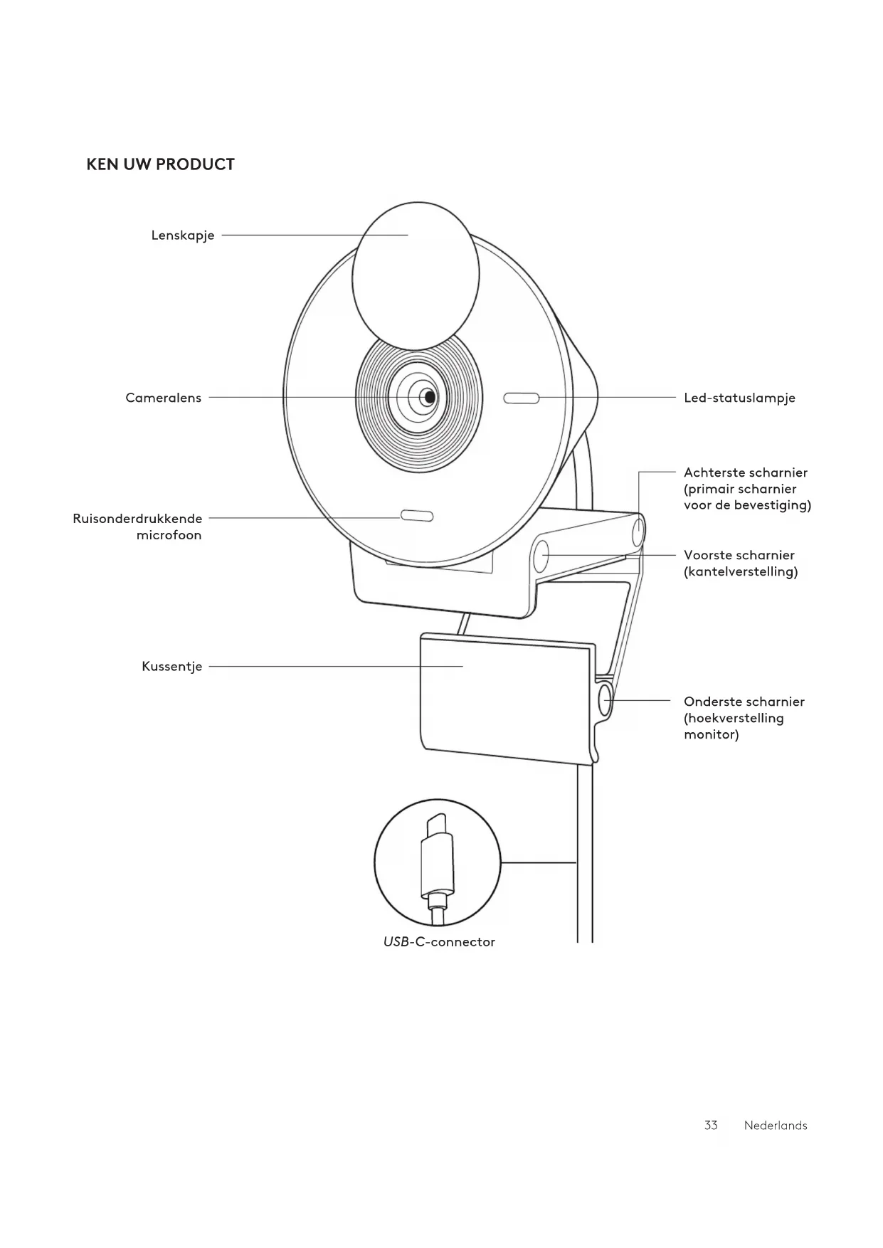 Steek de USB-C-connector van de camera indeovereenkomstige poort op uw computer. Indien mogelijk, raden we aan de Brio 300 direct op uw computer aan te sluiten en niet viaeen USB-hub. 35NederlandsLENSKAPJE OPENEN Open het lenskapje door het zachtjes linksomof rechtsom te duwen. Het kapje klikt vast wanneer het in de positie Uit boven decamera staat. TUNE INSTALLEREN Logi Tune helpt de prestaties van uw webcam te verbeteren door middel van regelmatige soware- en rmware-updates. Het is raadzaam uw webcam te updaten envan de geweldige functies van Brio 300 teproteren. Download hiervoor Logi Tune via www.logitech.com/tune Logi Tune Webcam: Hoogte x breedte x diepte: 65,63 mm (2.58 in) x 53,1 mm (2,09 in) x 45 mm (1,78 in), incl. bevestigingsclip Productgewicht: 74,6 g (2,63 oz), incl. bevestigingsclip en kabel Lengte geïntegreerde kabel: 1,5m (5) AFMETINGEN 36Nederlands© 2023 Logitech. Logitech, Logi en het Logitech-logo zijn handelsmerken of gedeponeerde handelsmerken van Logitech Europe S.A. en/of haar dochterondernemingen in de VS en andere landen. USB-C en alle andere handelsmerken zijn eigendom van hun respectievelijke eigenaren. Logitech aanvaardt geen aansprakelijkheid voor eventuele fouten in deze handleiding. Deinformatie hierin is aan verandering zonder kennisgeving onderhevig. www.logitech.com/support/Brio300PRODUKTÖVERSIKT Indikatorlampa Främre gångjärn (vinklingsjustering) Gångjärnsfot (justering avbildskärmsvinkel) Bakre gångjärn (primärt monteringsgångjärn) Sekretesskydd Kameraobjektiv Brusreducerande mikrofon Vadderad fot USB-C-kontakt 38 NederlandsUSB-C INNEHÅLL