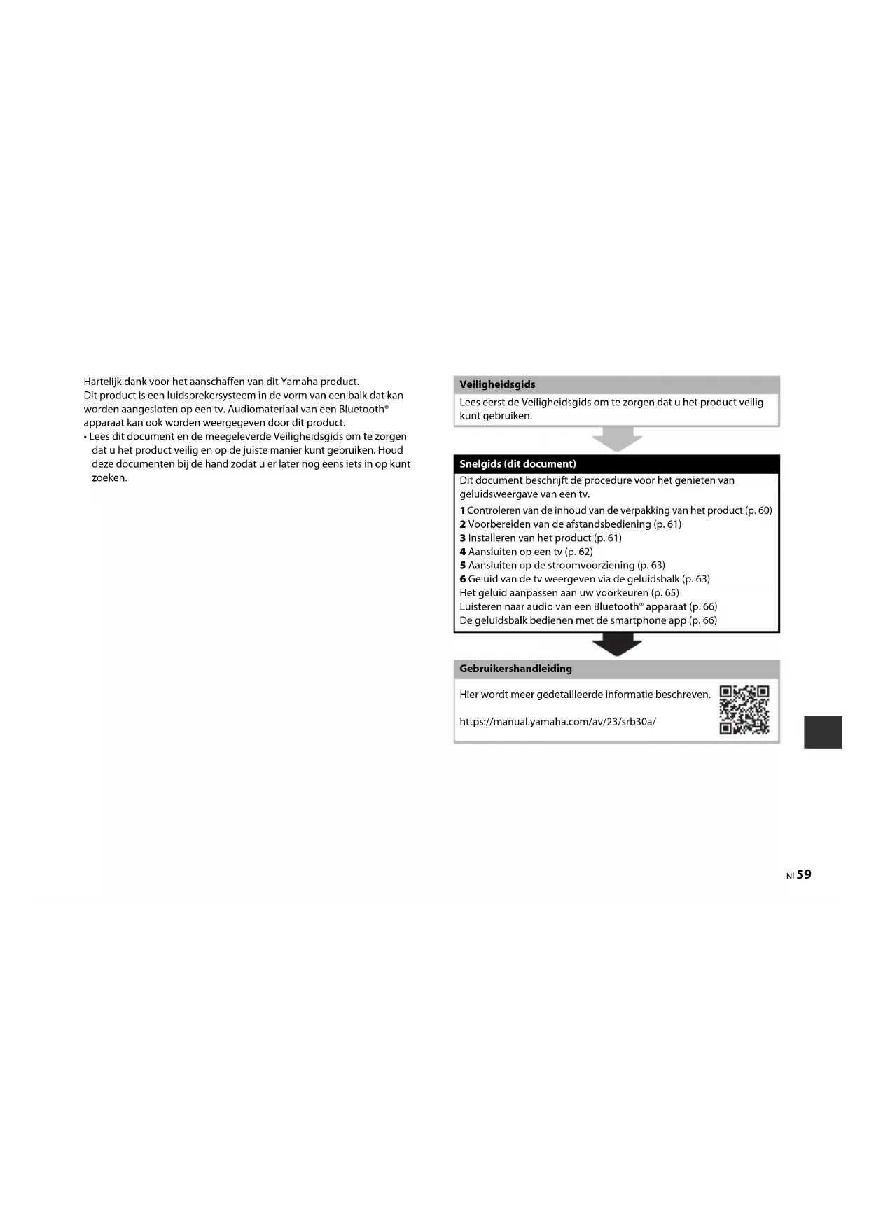 Controleren van de inhoud van de verpakking van het product (p. 60) 2 Voorbereiden van de afstandsbediening (p. 61) 3 Installeren van het product (p. 61) 4 Aansluiten op een tv (p. 62) 5 Aansluiten op de stroomvoorziening (p. 63) 6 Geluid van de tv weergeven via de geluidsbalk (p. 63) Het geluid aanpassen aan uw voorkeuren (p. 65) Luisteren naar audio van een Bluetooth® apparaat (p. 66) De geluidsbalk bedienen met de smartphone app (p. 66) Gebruikershandleiding Hier wordt meer gedetailleerde informatie beschreven. https://manual.yamaha.com/av/23/srb30a/60 Nl