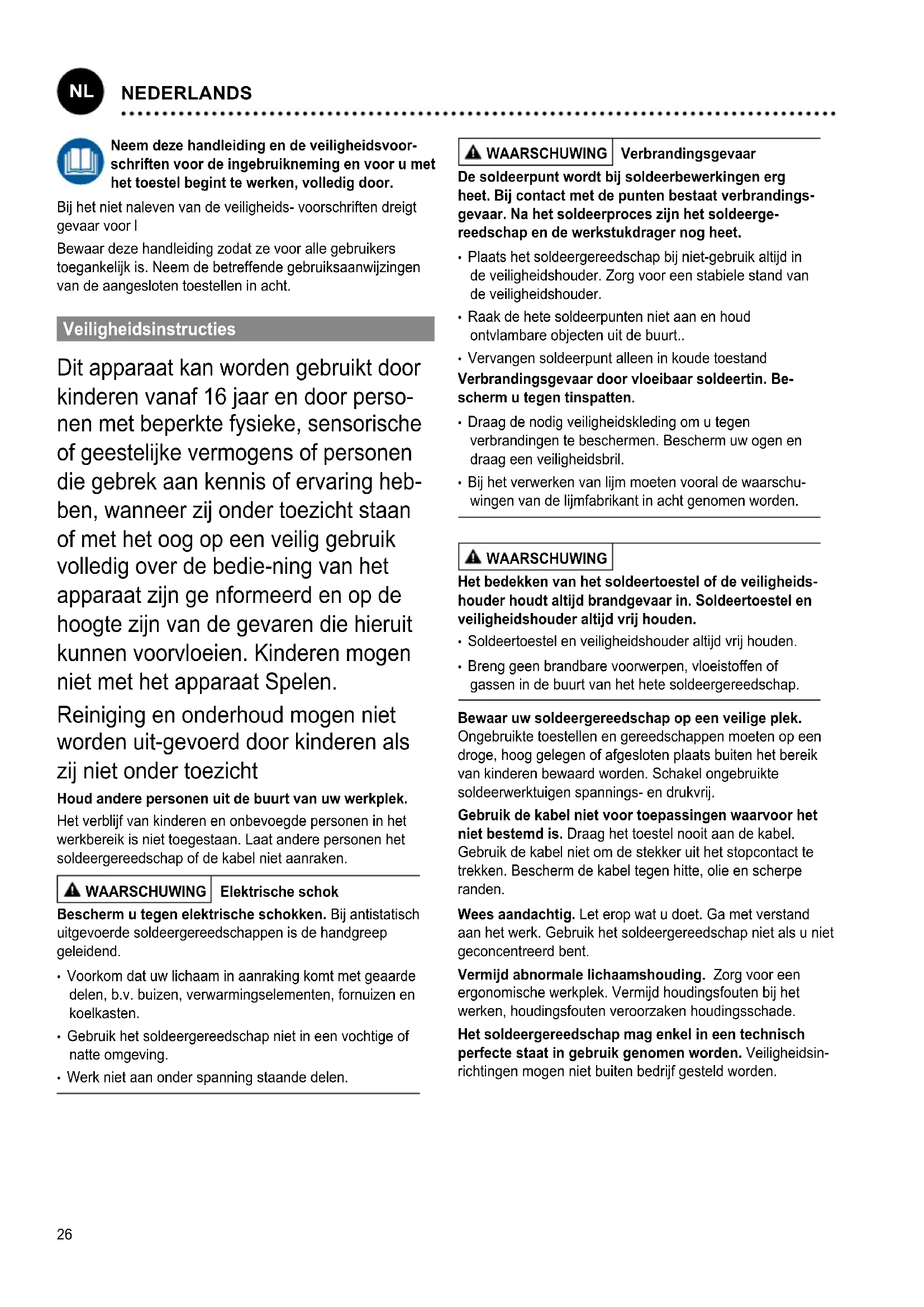PORTUGUES26 Neem deze handleiding en de veiligheidsvoor- schriften voor de ingebruikneming en voor u met het toestel begint te werken, volledig door. Bij het niet naleven van de veiligheids- voorschriften dreigt gevaar voor l Bewaar deze handleiding zodat ze voor alle gebruikers toegankelijk is. Neem de betreffende gebruiksaanwijzingen van de aangesloten toestellen in acht. Veiligheidsinstructies Dit apparaat kan worden gebruikt door kinderen vanaf 16 jaar en door perso- nen met beperkte fysieke, sensorische of geestelijke vermogens of personen die gebrek aan kennis of ervaring heb- ben, wanneer zij onder toezicht staan of met het oog op een veilig gebruik volledig over de bedie-ning van het apparaat zijn ge nformeerd en op de hoogte zijn van de gevaren die hieruit kunnen voorvloeien. Kinderen mogen niet met het apparaat Spelen. Reiniging en onderhoud mogen niet worden uit-gevoerd door kinderen als zij niet onder toezicht Houd andere personen uit de buurt van uw werkplek. Het verblijf van kinderen en onbevoegde personen in het werkbereik is niet toegestaan. Laat andere personen het soldeergereedschap of de kabel niet aanraken. WAARSCHUWING Elektrische schok Bescherm u tegen elektrische schokken. Bij antistatisch uitgevoerde soldeergereedschappen is de handgreep geleidend.