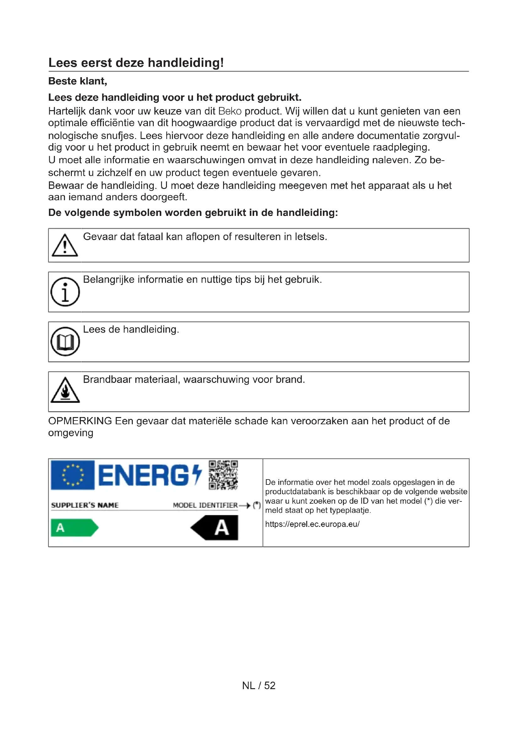 DENL / 52 Lees eerst deze handleiding! Beste klant, Lees deze handleiding voor u het product gebruikt. Hartelijk dank voor uw keuze van dit Beko product. Wij willen dat u kunt genieten van een optimale efficiëntie van dit hoogwaardige product dat is vervaardigd met de nieuwste tech- nologische snufjes. Lees hiervoor deze handleiding en alle andere documentatie zorgvul- dig voor u het product in gebruik neemt en bewaar het voor eventuele raadpleging. U moet alle informatie en waarschuwingen omvat in deze handleiding naleven. Zo be- schermt u zichzelf en uw product tegen eventuele gevaren. Bewaar de handleiding. U moet deze handleiding meegeven met het apparaat als u het aan iemand anders doorgeeft. De volgende symbolen worden gebruikt in de handleiding: Gevaar dat fataal kan aflopen of resulteren in letsels. Belangrijke informatie en nuttige tips bij het gebruik. Lees de handleiding. Brandbaar materiaal, waarschuwing voor brand. OPMERKING Een gevaar dat materiële schade kan veroorzaken aan het product of de omgeving De informatie over het model zoals opgeslagen in de productdatabank is beschikbaar op de volgende website waar u kunt zoeken op de ID van het model (*) die ver- meld staat op het typeplaatje. https://eprel.ec.europa.eu/NL / 53 1 Veiligheidsinstructies.................... 54