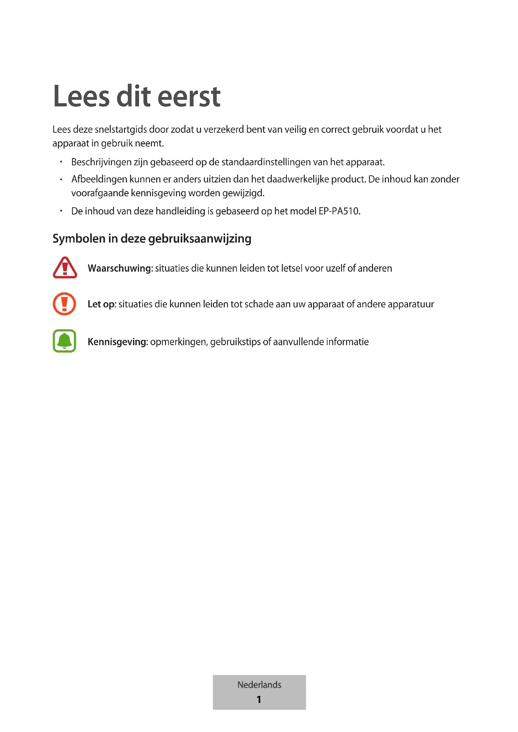 Lees dit eerst Lees deze snelstartgids door zodat u verzekerd bent van veilig en correct gebruik voordat u het apparaat in gebruik neemt.