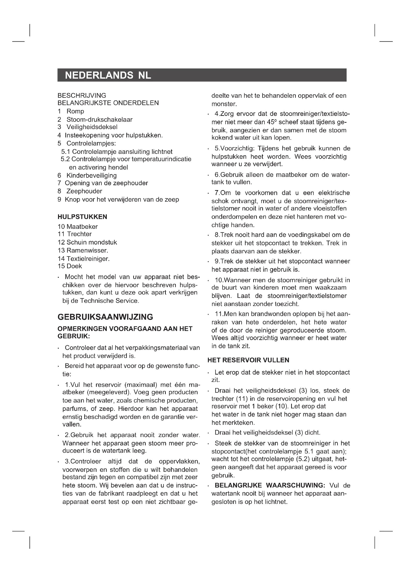 - BELANGRIJKE WAARSCHUWING: Vul de watertank nooit bij wanneer het apparaat aan- gesloten is op het lichtnet.NL GEBRUIK: