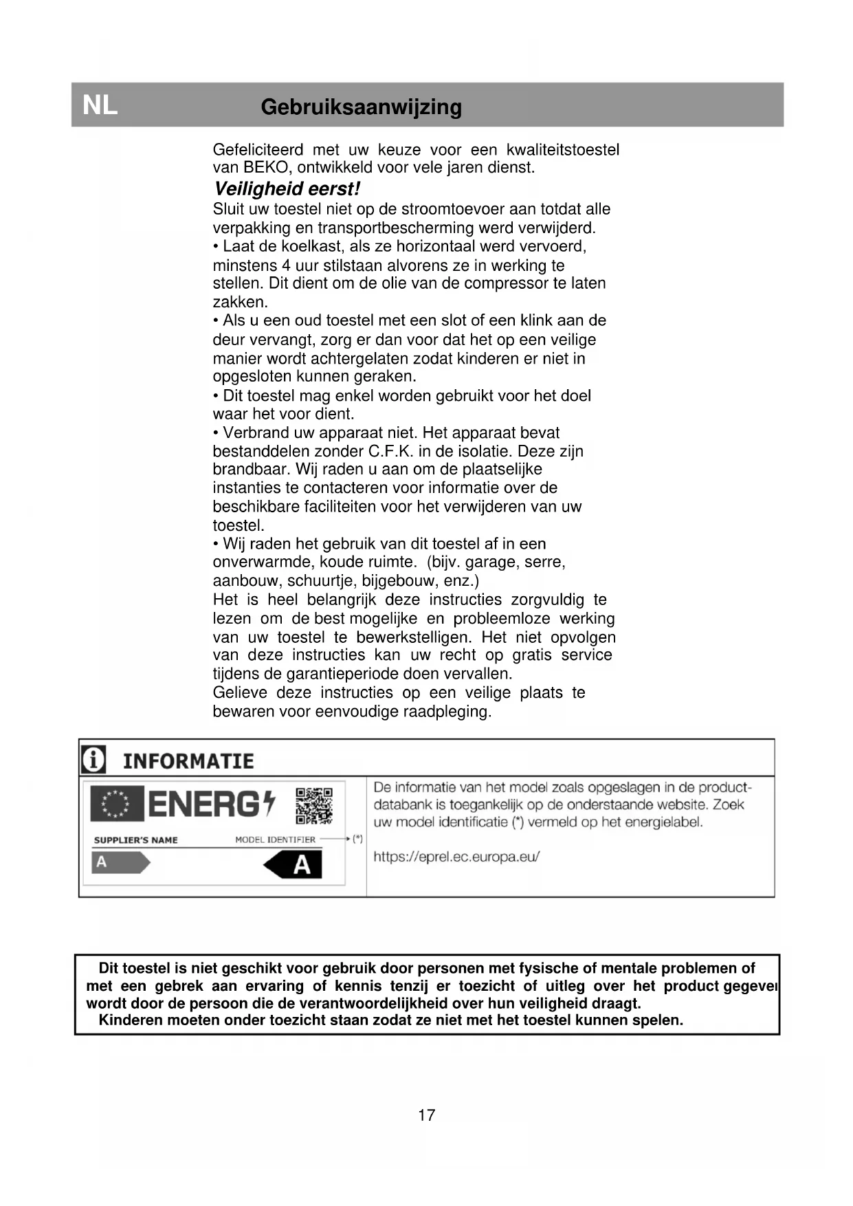 Dit toestel is niet geschikt voor gebruik door personen met fysische of mentale problemen of met een gebrek aan ervaring of kennis tenzij er toezicht of uitleg over het product gegeven wordt door de persoon die de verantwoordelijkheid over hun veiligheid draagt. Kinderen moeten onder toezicht staan zodat ze niet met het toestel kunnen spelen.NL Gebruiksaanwijzing Elektriciteitsvereisten Vergewis u ervan, alvorens u de stekker in het stopcontact steekt, dat de voltage en de frequentie op de kwalificatieplaat binnenin het toestel overeenkomen met uw stroomtoevoer. Wij raden u aan dit toestel aan te sluiten op de hoofdtoevoer via een naar behoren aangesloten en verzekerd stopcontact op een onmiddellijk bereikbare plaats. Na plaatsing van het apparaat moet de stekker eenvoudig toegankelijk blijven, zodat het mogelijk is om het apparaat na installatie van de stroomtoevoer af te sluiten. Waarschuwing! Dit toestel moet worden geaard. Reparaties aan de elektrische apparatuur mogen alleen door gekwalificeerde deskundigen worden uitgevoerd. Als de stroomkabel beschadigd is, moet deze – om gevaar te voorkomen – door de fabrikant of klantenservice worden vervangen. OPGELET! Dit toestel werkt op R600a. Dit is een milieuvriendelijk, maar brandbaar gas. Tijdens het transport en de plaatsing van het product moet er zorg voor worden gedragen dat het koelsysteem niet wordt beschadigd. Als het koelsysteem toch wordt beschadigd en er ontstaat een gaslek, houd het product dan verwijderd van open vuurbronnen en verlucht de kamer een tijdje. WAARSCHUWING - Gebruik geen andere mechanische toestellen of andere middelen om het ontdooiingproces te versnellen dan die toestellen of middelen die door de fabrikant worden aangeraden. WAARSCHUWING - Beschadig het koelcircuit niet. WAARSCHUWING - Gebruik geen elektrische toestellen in de bewaarladen van het toestel, tenzij ze door de fabrikant worden aangeraden. WAARSCHUWING - Indien het netsnoer beschadigd is, moet dit door de producent, de dealer of een ander gekwalificeerd persoon worden gerepareerd om gevaar te voorkomen. Transportinstructies