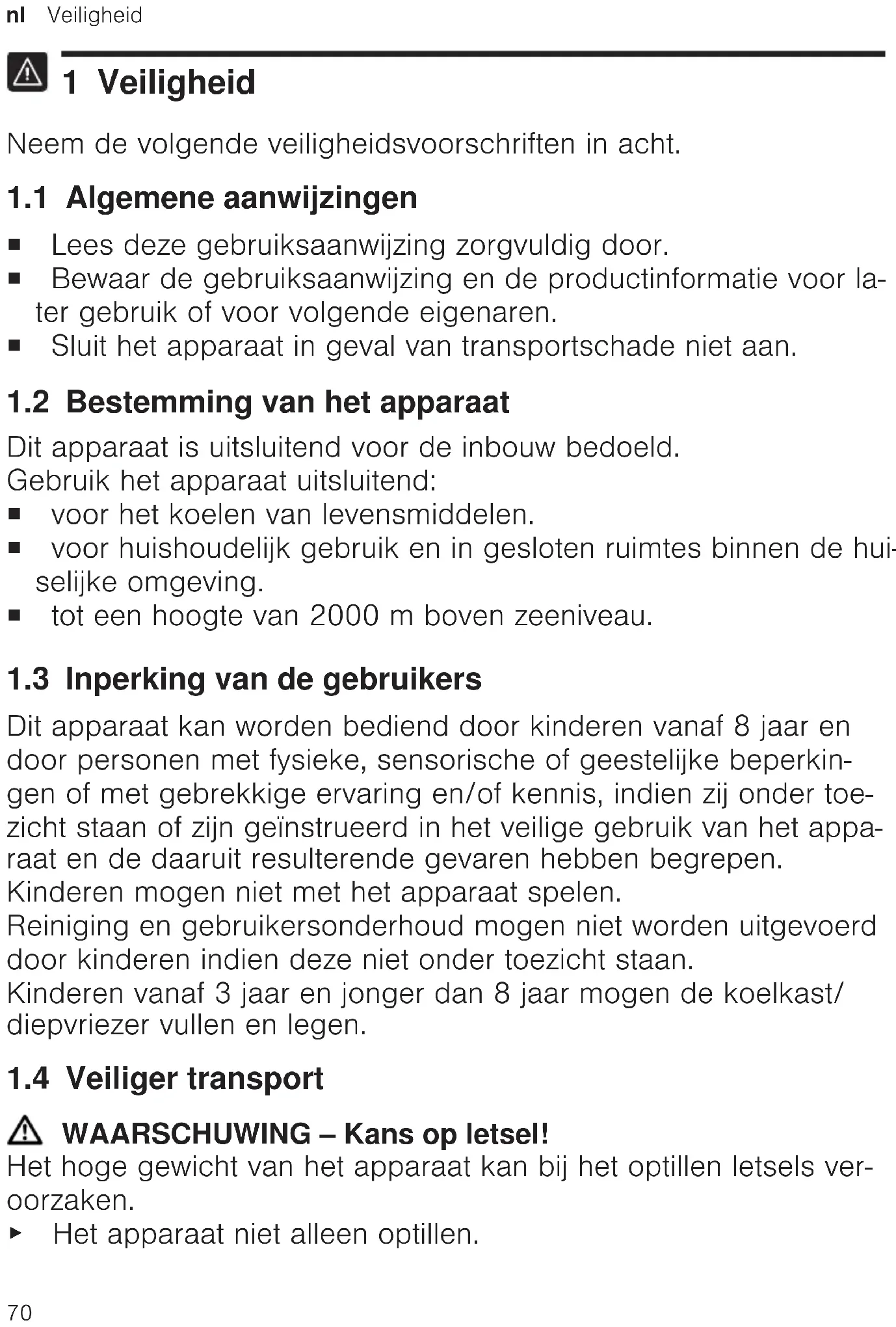 1 Veiligheid Neem de volgende veiligheidsvoorschriften in acht. 1.1 Algemene aanwijzingen ¡ Lees deze gebruiksaanwijzing zorgvuldig door. ¡ Bewaar de gebruiksaanwijzing en de productinformatie voor la- ter gebruik of voor volgende eigenaren. ¡ Sluit het apparaat in geval van transportschade niet aan. 1.2 Bestemming van het apparaat Dit apparaat is uitsluitend voor de inbouw bedoeld. Gebruik het apparaat uitsluitend: ¡ voor het koelen van levensmiddelen. ¡ voor huishoudelijk gebruik en in gesloten ruimtes binnen de hui- selijke omgeving. ¡ tot een hoogte van 2000m boven zeeniveau. 1.3 Inperking van de gebruikers Dit apparaat kan worden bediend door kinderen vanaf 8 jaar en door personen met fysieke, sensorische of geestelijke beperkin- gen of met gebrekkige ervaring en/of kennis, indien zij onder toe- zicht staan of zijn geïnstrueerd in het veilige gebruik van het appa- raat en de daaruit resulterende gevaren hebben begrepen. Kinderen mogen niet met het apparaat spelen. Reiniging en gebruikersonderhoud mogen niet worden uitgevoerd door kinderen indien deze niet onder toezicht staan. Kinderen vanaf 3 jaar en jonger dan 8 jaar mogen de koelkast/ diepvriezer vullen en legen. 1.4 Veiliger transport WAARSCHUWING‒Kans op letsel! Het hoge gewicht van het apparaat kan bij het optillen letsels ver- oorzaken. ▶ Het apparaat niet alleen optillen.Veiligheid nl