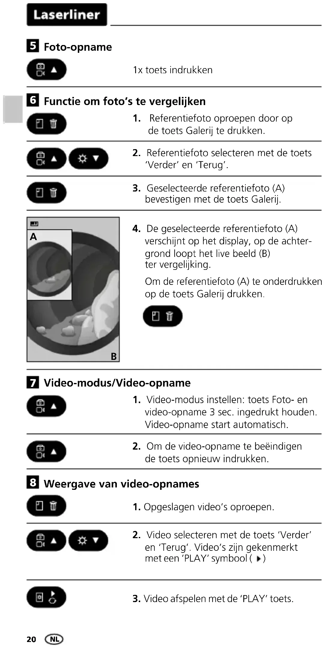 verschijnt op het display, op de achter- grond loopt het live beeld (B) ter vergelijking. Om de referentiefoto (A) te onderdrukken op de toets Galerij drukken. Functie om foto’s te vergelijken