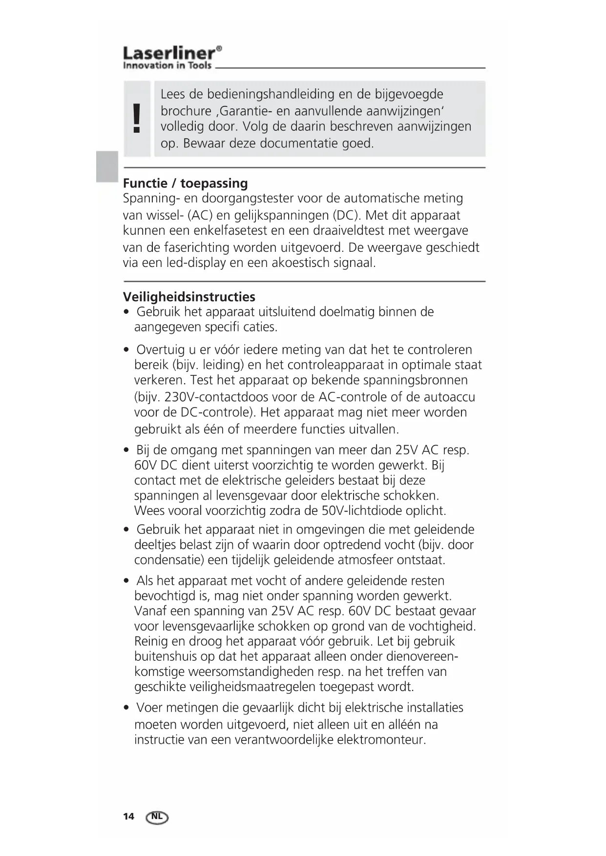 - Overtuig u er vóór iedere meting van dat het te controleren bereik (bijv. leiding) en het controleapparaat in optimale staat verkeren. Test het apparaat op bekende spanningsbronnen (bijv. 230V-contactdoos voor de AC-controle of de autoaccu voor de DC-controle). Het apparaat mag niet meer worden gebruikt als één of meerdere functies uitvallen.
