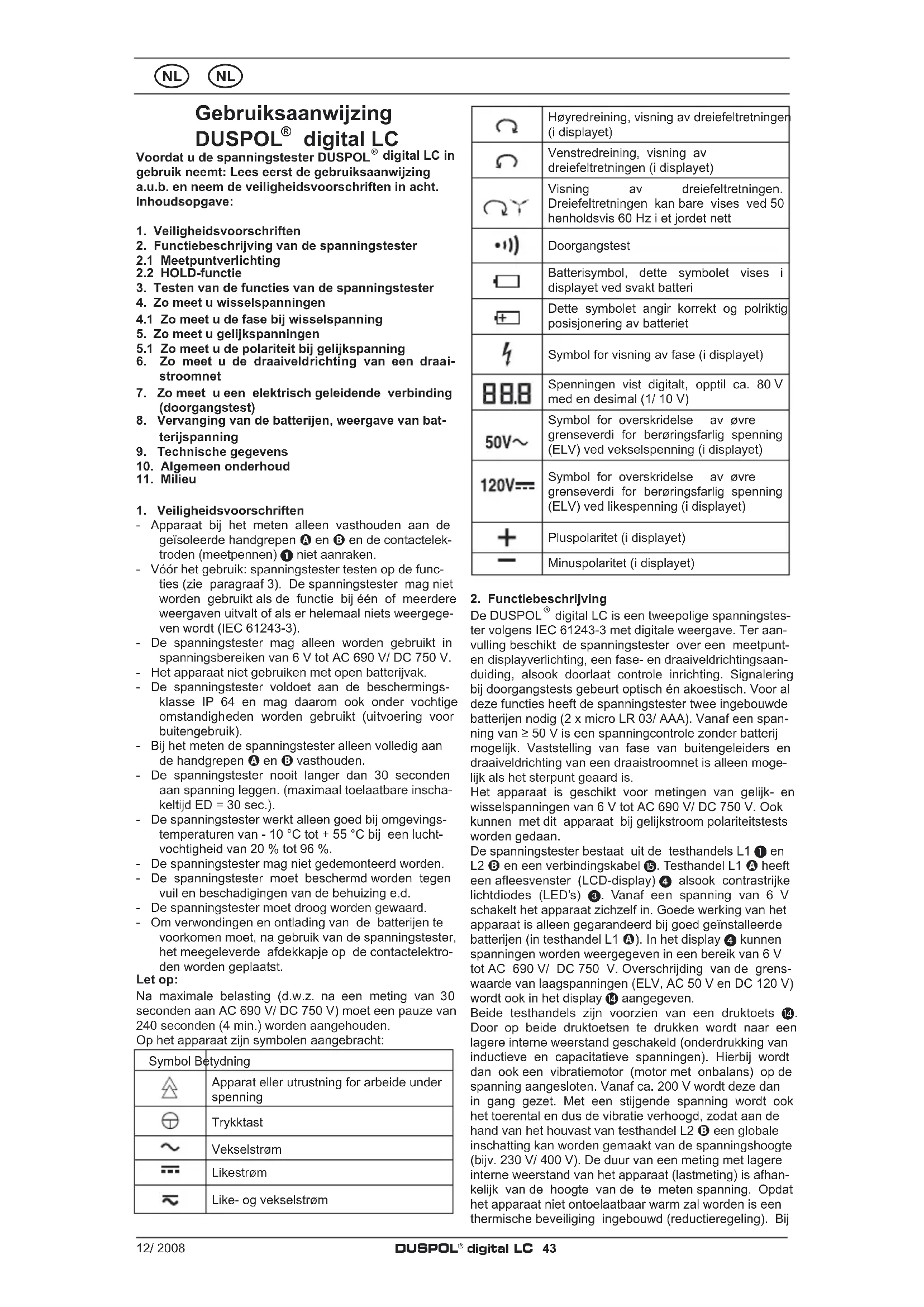 digital LC is een tweepolige spanningstes- ter volgens IEC 61243-3 met digitale weergave. Ter aan- vulling beschikt de spanningstester over een meetpunt- en displayverlichting, een fase- en draaiveldrichtingsaan- duiding, alsook doorlaat controle inrichting. Signalering bij doorgangstests gebeurt optisch én akoestisch. Voor al deze functies heeft de spanningstester twee ingebouwde batterijen nodig (2 x micro LR 03/ AAA). Vanaf een span- ning van ≥ 50 V is een spanningcontrole zonder batterij mogelijk. Vaststelling van fase van buitengeleiders en draaiveldrichting van een draaistroomnet is alleen moge- lijk als het sterpunt geaard is. Het apparaat is geschikt voor metingen van gelijk- en wisselspanningen van 6 V tot AC 690 V/ DC 750 V. Ook kunnen met dit apparaat bij gelijkstroom polariteitstests worden gedaan. De spanningstester bestaat uit de testhandels L1 A en L2 B en een verbindingskabel . Testhandel L1 A heeft een afleesvenster (LCD-display) 4 alsook contrastrijke lichtdiodes (LED’s) 3. Vanaf een spanning van 6 V schakelt het apparaat zichzelf in. Goede werking van het apparaat is alleen gegarandeerd bij goed geïnstalleerde batterijen (in testhandel L1 A). In het display 4 kunnen spanningen worden weergegeven in een bereik van 6 V tot AC 690 V/ DC 750 V. Overschrijding van de grens- waarde van laagspanningen (ELV, AC 50 V en DC 120 V) wordt ook in het display aangegeven. Beide testhandels zijn voorzien van een druktoets . Door op beide druktoetsen te drukken wordt naar een lagere interne weerstand geschakeld (onderdrukking van inductieve en capacitatieve spanningen). Hierbij wordt dan ook een vibratiemotor (motor met onbalans) op de spanning aangesloten. Vanaf ca. 200 V wordt deze dan in gang gezet. Met een stijgende spanning wordt ook het toerental en dus de vibratie verhoogd, zodat aan de hand van het houvast van testhandel L2 B een globale inschatting kan worden gemaakt van de spanningshoogte (bijv. 230 V/ 400 V). De duur van een meting met lagere interne weerstand van het apparaat (lastmeting) is afhan- kelijk van de hoogte van de te meten spanning. Opdat het apparaat niet ontoelaatbaar warm zal worden is een thermische beveiliging ingebouwd (reductieregeling). Bij12/ 2008 DUSPOL