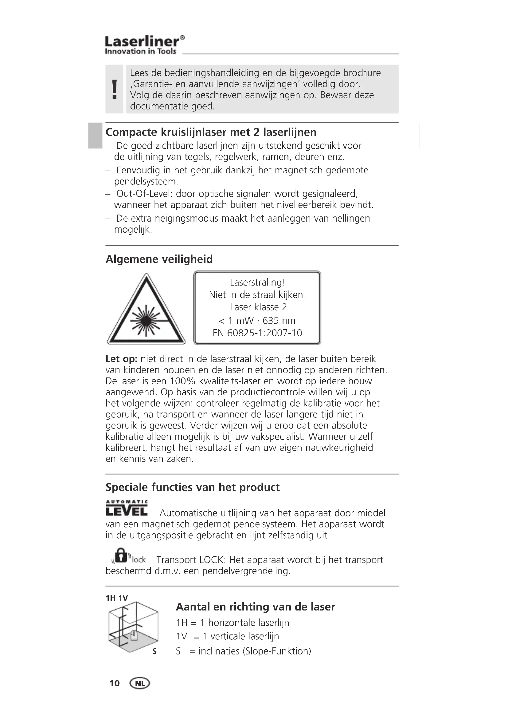 2,5 m< 2 mm = OK10 Compacte kruislijnlaser met 2 laserlijnen – De goed zichtbare laserlijnen zijn uitstekend geschikt voor de uitlijning van tegels, regelwerk, ramen, deuren enz. – Eenvoudig in het gebruik dankzij het magnetisch gedempte pendelsysteem. – Out-Of-Level: door optische signalen wordt gesignaleerd, wanneer het apparaat zich buiten het nivelleerbereik bevindt. – De extra neigingsmodus maakt het aanleggen van hellingen mogelijk. Speciale functies van het product Automatische uitlijning van het apparaat door middel van een magnetisch gedempt pendelsysteem. Het apparaat wordt in de uitgangspositie gebracht en lijnt zelfstandig uit. Transport LOCK: Het apparaat wordt bij het transport beschermd d.m.v. een pendelvergrendeling. Let op: niet direct in de laserstraal kijken, de laser buiten bereik van kinderen houden en de laser niet onnodig op anderen richten. De laser is een 100% kwaliteits-laser en wordt op iedere bouw aangewend. Op basis van de productiecontrole willen wij u op het volgende wijzen: controleer regelmatig de kalibratie voor het gebruik, na transport en wanneer de laser langere tijd niet in gebruik is geweest. Verder wijzen wij u erop dat een absolute kalibratie alleen mogelijk is bij uw vakspecialist. Wanneer u zelf kalibreert, hangt het resultaat af van uw eigen nauwkeurigheid en kennis van zaken. Algemene veiligheid Laserstraling! Niet in de straal kijken! Laser klasse 2 < 1 mW · 635 nm EN 60825-1:2007-10 Aantal en richting van de laser 1H = 1 horizontale laserlijn 1V = 1 verticale laserlijn S = inclinaties (Slope-Funktion)