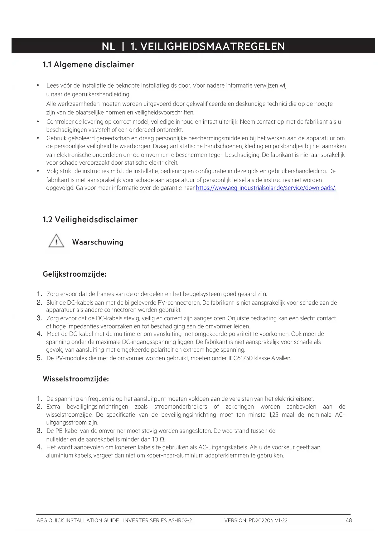 - Volg strikt de instructies m.b.t. de installatie, bediening en configuratie in deze gids en gebruikershandleiding. De fabrikant is niet aansprakelijk voor schade aan apparatuur of persoonlijk letsel als de instructies niet worden opgevolgd. Ga voor meer informatie over de garantie naar https://www.aeg-industrialsolar.de/service/downloads/