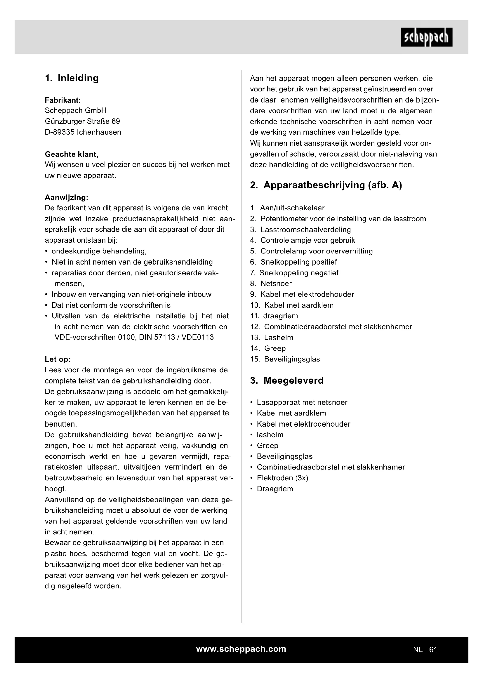 - Uitvallen van de elektrische installatie bij het niet in acht nemen van de elektrische voorschriften en VDE-voorschriften 0100, DIN 57113 / VDE0113 Let op: Lees voor de montage en voor de ingebruikname de complete tekst van de gebruikshandleiding door. De gebruiksaanwijzing is bedoeld om het gemakkelij- ker te maken, uw apparaat te leren kennen en de be- oogde toepassingsmogelijkheden van het apparaat te benutten. De gebruikshandleiding bevat belangrijke aanwij- zingen, hoe u met het apparaat veilig, vakkundig en economisch werkt en hoe u gevaren vermijdt, repa- ratiekosten uitspaart, uitvaltijden vermindert en de betrouwbaarheid en levensduur van het apparaat ver- hoogt. Aanvullend op de veiligheidsbepalingen van deze ge- bruikshandleiding moet u absoluut de voor de werking van het apparaat geldende voorschriften van uw land in acht nemen. Bewaar de gebruiksaanwijzing bij het apparaat in een plastic hoes, beschermd tegen vuil en vocht. De ge- bruiksaanwijzing moet door elke bediener van het ap- paraat voor aanvang van het werk gelezen en zorgvul- dig nageleefd worden.www.scheppach.com