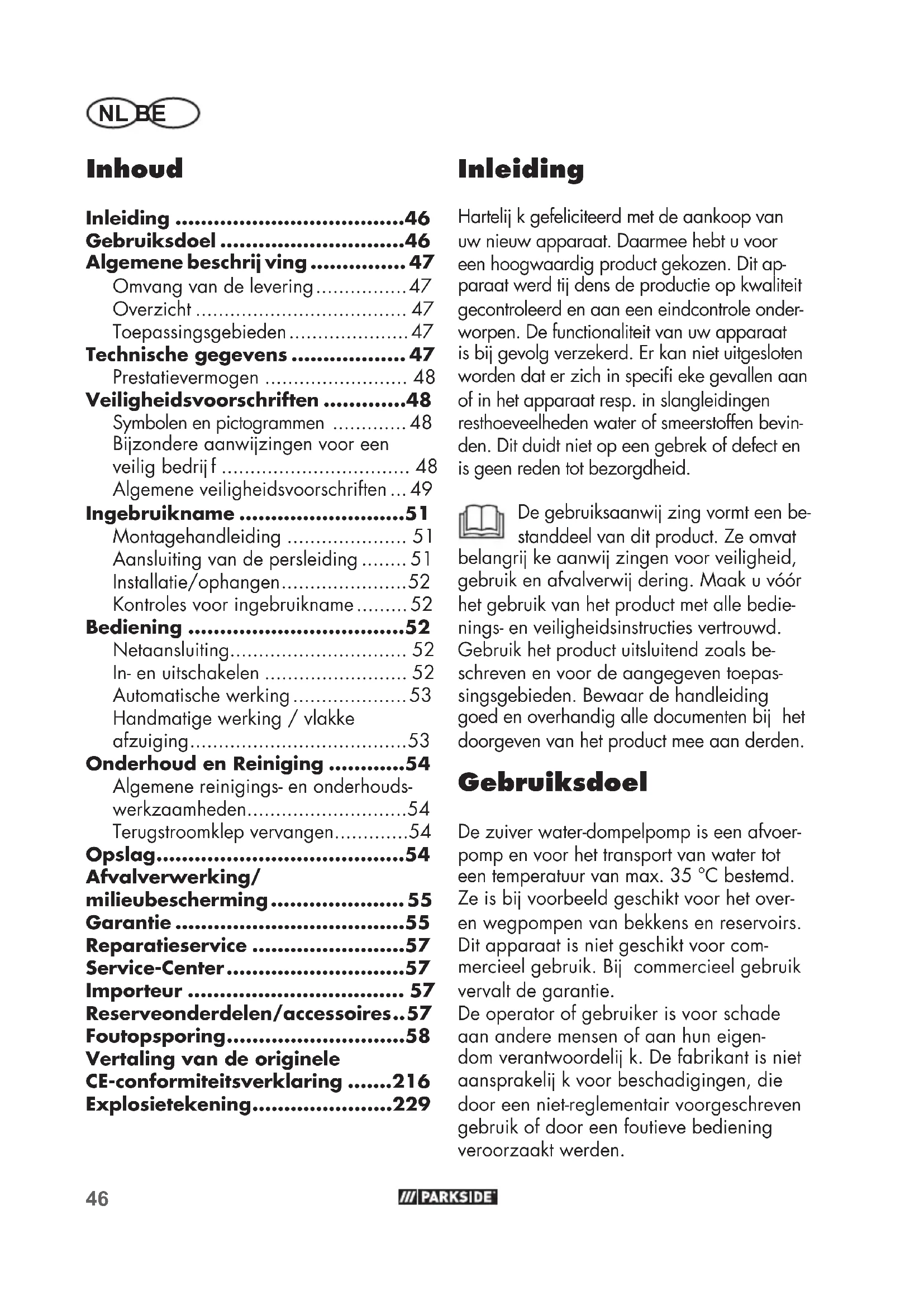 Afvalverwerking/ milieubescherming Breng het apparaat, de toebehoren en de verpakking naar een geschikt recyclage- punt. Apparaten horen niet bij het huis- vuil. Lever het apparaat in bij een recyclepunt. De gebruikte kunststof en metalen onder- delen kunnen nauwkeurig worden geschei- den, zodat ze eenvoudig opnieuw kunnen worden gebruikt. Raadpleeg hiervoor ons servicecenter. De afvalverwij dering van uw defecte inge- zonden apparaten voeren wij gratis door. Garantie Geachte cliënte, geachte klant, U krij gt op dit apparaat 3 jaar garantie, te rekenen vanaf de datum van aankoop. Ingeval van gebreken aan dit product heeft u tegenover de verkoper van het product wettelij ke rechten. Deze wettelij ke rechten worden door onze hierna beschreven ga- rantie niet beperkt. Garantievoorwaarden De garantietermij n begint met de datum van aankoop. Gelieve de originele kassa- bon goed te bewaren. Dit document wordt als bewij s van de aankoop benodigd. Indien er zich binnen drie jaar, te rekenen vanaf de datum van aankoop van dit pro- duct, een materiaal- of fabricagefout voor- doet, wordt het product door ons – naar onze keuze – voor u gratis gerepareerd of vervangen. Deze garantievergoeding stelt voorop dat binnen de termij n van drie jaar het defecte apparaat en het bewij s van aankoop (kassabon) voorgelegd en dat schriftelij k kort beschreven wordt, waarin het gebrek bestaat en wanneer het zich voorgedaan heeft. Als het defect door onze garantie gedekt is, krij gt u het gerepareerde of een nieuw product terug. Met herstelling of uitwisse- ling van het product begint er geen nieuwe garantieperiode. Garantieperiode en wettelij ke kwaliteitsgarantie De garantieperiode wordt door de ga- rantievergoeding niet verlengd. Dit geldt ook voor vervangen en gerepareerde onderdelen. Eventueel al bij de aankoop bestaande beschadigingen en gebreken moeten onmiddellij k na het uitpakken ge- meld worden. Na het verstrij ken van de garantieperiode tot stand komende repara- ties worden tegen verplichte betaling van de kosten uitgevoerd. Omvang van de garantie Het apparaat werd volgens strikte kwali- teitsrichtlij nen zorgvuldig geproduceerd en vóór afl evering nauwgezet getest. De garantievergoeding geldt voor materi- aal- of fabricagefouten. Deze garantie is niet van toepassing op productonderdelen, die aan een normale slij tage blootgesteld zij n en daarom als aan slij tage onderhevi- ge onderdelen beschouwd kunnen worden (b.v. terugstroomklep, afdichtring) of op be- schadigingen aan breekbare onderdelen (b.v. schakelaars). Deze garantie valt weg wanneer het pro- duct beschadigd, niet oordeelkundig ge- bruikt of niet onderhouden werd. Voor een vakkundig gebruik van het product dienen56 NL BE alle in de gebruiksaanwij zing vermelde aanwij zingen nauwgezet in acht genomen te worden. Gebruiksdoeleinden en hande- lingen, die in de gebruiksaanwij zing afge- raden worden of waarvoor gewaarschuwd wordt, dienen onvoorwaardelij k vermeden te worden. Het product is uitsluitend voor het privé- en niet voor het commerciële gebruik be- stemd. Bij een verkeerde of onoordeelkun- dige behandeling, toepassing van geweld en bij ingrepen, die niet door het door ons geautoriseerde servicefi liaal doorgevoerd werden, valt de garantie weg. Er wordt geen garantie gegeven indien de pomp wordt gebruikt voor het afvoeren van zanderig water of agressieve vloeistof- fen, gebruik van geweld of onvoldoende en ondeskundig onderhoud waardoor dichtingen, scheprad, motor of andere on- derdelen beschadigd kunnen raken. Ook waterdompelpompen zij n niet geschikt voor het afvoeren van schurende materia- len (zand, stenen). Let op: dompelpompen zij n afwate- ringspompen. Dompelpompen zij n zo gebouwd, dat zij binnen hun vermogens- klasse een bepaalde hoeveelheid water zo snel mogelij k kunnen op- of wegpompen. Dompelpompen zij n niet geschikt voor ir- rigatiedoeleinden (bij voorbeeld voor het besproeien van de tuin) of om permanent te laten pompen (bij voorbeeld voor beek- lopen of vij verfonteinen). Bij gebruik dat in strij d is met deze voorschriften vervalt de garantie op het apparaat. Controleer regelmatig het functioneren van de drij fschakelaar. Bij veronachtzaming of drooglopen van de pomp vervallen de garantie en aansprakelij kheid. In het bij zonder bij gebruik van dompel- pompen zonder bodemplaat, of (dit geldt voor alle pompen) bij beschadigingen die door het ophangen of vastzetten aan de stroomkabel veroorzaakt werden, vervalt de garantie. De pompen mogen niet drooglo- pen of aan vorst worden blootgesteld. Afhandeling ingeval van garantie Gelieve aan de volgende aanwij zingen gevolg te geven om een snelle behande- ling van uw verzoek te garanderen:
