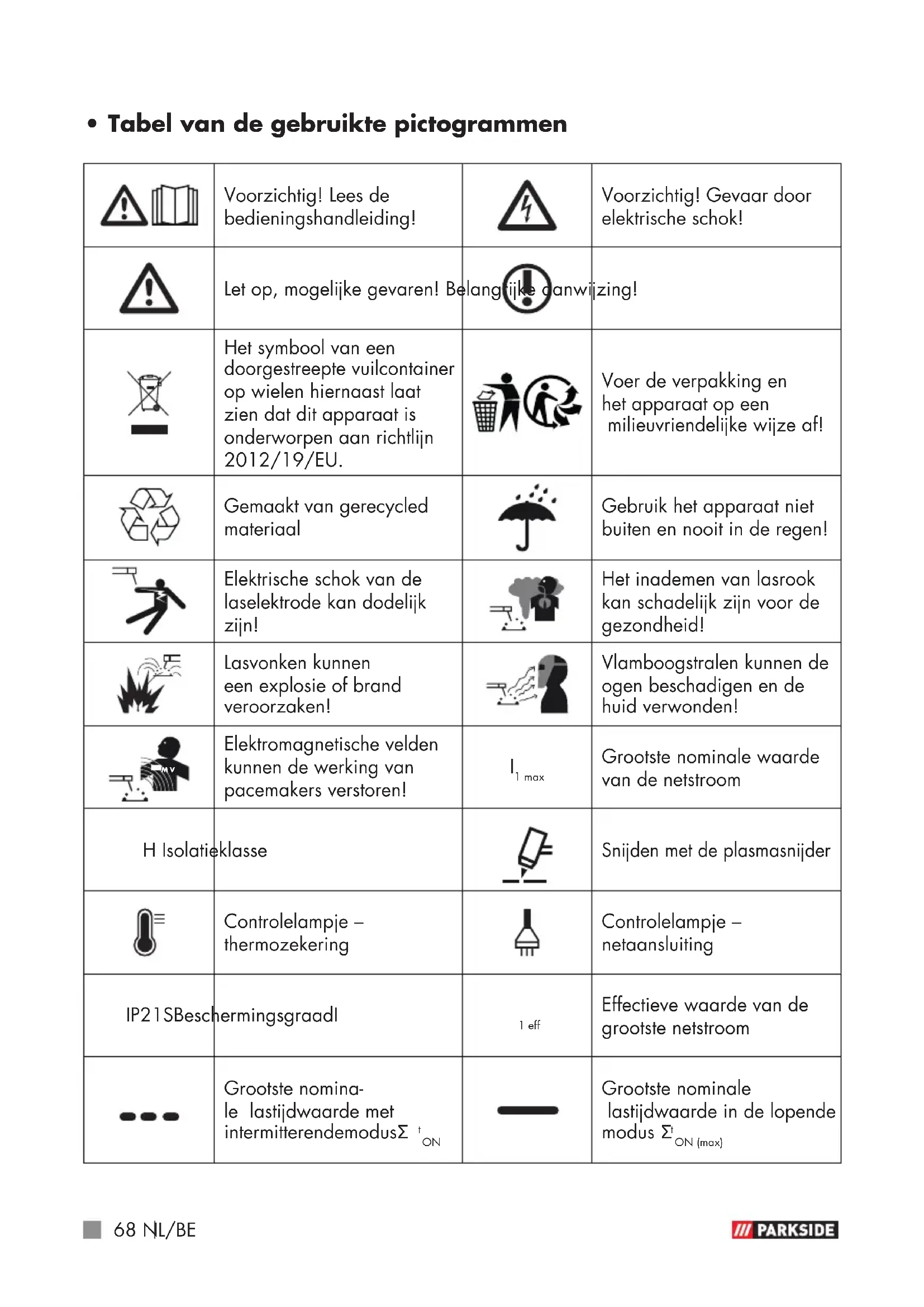 - Tabel van de gebruikte pictogrammen Voorzichtig! Lees de bedieningshandleiding! Voorzichtig! Gevaar door elektrische schok! Let op, mogelijke gevaren! Belangrijke aanwijzing! Het symbool van een doorgestreepte vuilcontainer op wielen hiernaast laat zien dat dit apparaat is onderworpen aan richtlijn 2012/19/EU. Voer de verpakking en het apparaat op een milieuvriendelijke wijze af! Gemaakt van gerecycled materiaal Gebruik het apparaat niet buiten en nooit in de regen! Elektrische schok van de laselektrode kan dodelijk zijn! Het inademen van lasrook kan schadelijk zijn voor de gezondheid! Lasvonken kunnen een explosie of brand veroorzaken! Vlamboogstralen kunnen de ogen beschadigen en de huid verwonden!