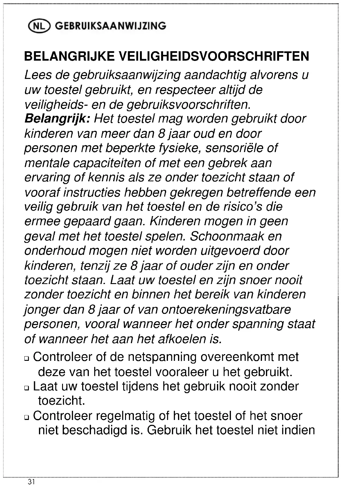 BELANGRIJKE VEILIGHEIDSVOORSCHRIFTEN Lees de gebruiksaanwijzing aandachtig alvorens u uw toestel gebruikt, en respecteer altijd de veiligheids- en de gebruiksvoorschriften. Belangrijk: Het toestel mag worden gebruikt door kinderen van meer dan 8 jaar oud en door personen met beperkte fysieke, sensoriële of mentale capaciteiten of met een gebrek aan ervaring of kennis als ze onder toezicht staan of vooraf instructies hebben gekregen betreffende een veilig gebruik van het toestel en de risico’s die ermee gepaard gaan. Kinderen mogen in geen geval met het toestel spelen. Schoonmaak en onderhoud mogen niet worden uitgevoerd door kinderen, tenzij ze 8 jaar of ouder zijn en onder toezicht staan. Laat uw toestel en zijn snoer nooit zonder toezicht en binnen het bereik van kinderen jonger dan 8 jaar of van ontoerekeningsvatbare personen, vooral wanneer het onder spanning staat of wanneer het aan het afkoelen is. ❑ Controleer of de netspanning overeenkomt met deze van het toestel vooraleer u het gebruikt. ❑ Laat uw toestel tijdens het gebruik nooit zonder toezicht. ❑ Controleer regelmatig of het toestel of het snoer niet beschadigd is. Gebruik het toestel niet indien32
