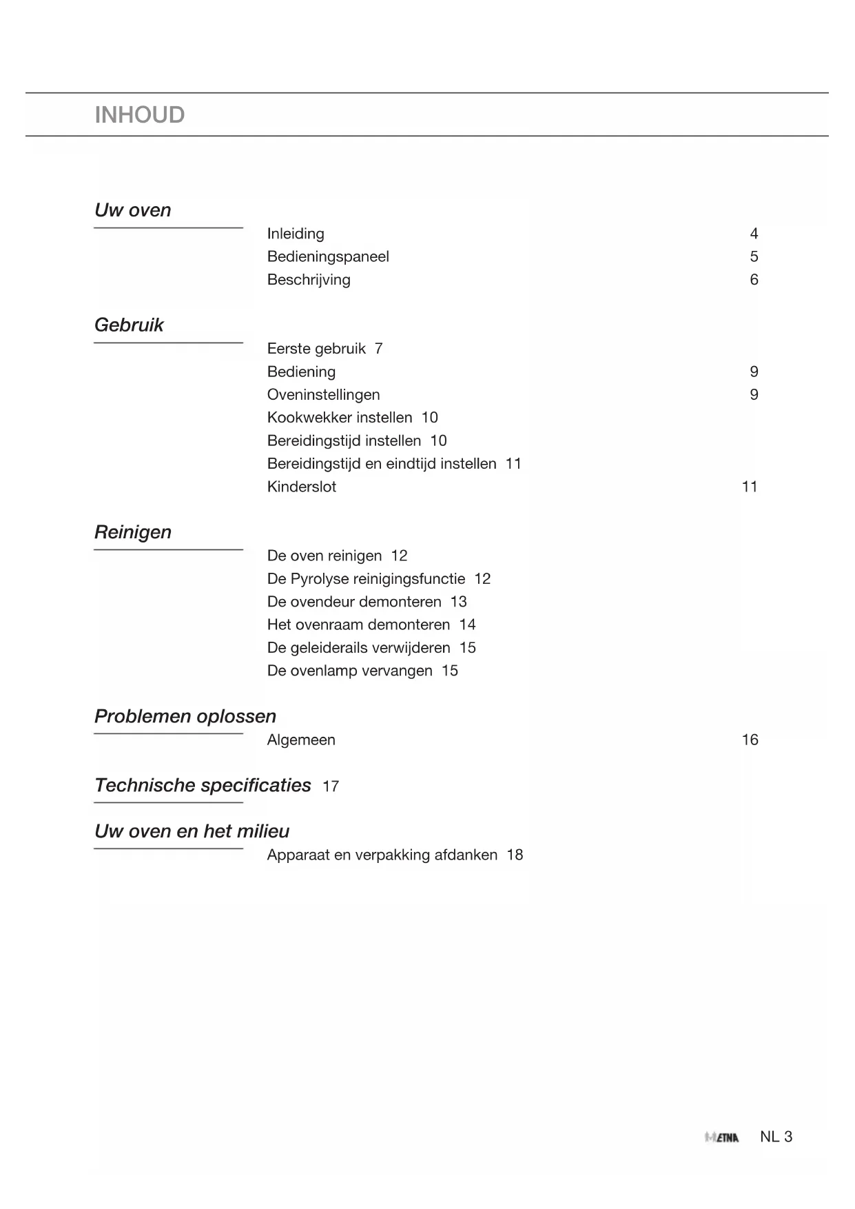 OVEN FOUR OFEN OVEN OP670 ---NL Gebruiksaanwijzing NL 3 - NL 18 FR Mode d’emploi FR 3 - FR 18 DE Bedienungsanleitung DE 3 - DE 18 EN Instructions for use EN 3 - EN 18 Gebruikte pictogrammen - Pictogrammes utilisés - Benutzte Piktogramme Pictograms used Belangrijk om te weten - Important à savoir - Wissenswertes - Important information Tip - Conseil - TippNL 3 INHOUD Uw oven Inleiding 4 Bedieningspaneel 5 Beschrijving 6 Gebruik Eerste gebruik 7 Bediening 9 Oveninstellingen 9 Kookwekker instellen 10 Bereidingstijd instellen 10 Bereidingstijd en eindtijd instellen 11 Kinderslot 11 Reinigen De oven reinigen 12 De Pyrolyse reinigingsfunctie 12 De ovendeur demonteren 13 Het ovenraam demonteren 14 De geleiderails verwijderen 15 De ovenlamp vervangen 15 Problemen oplossen Algemeen 16 Technische specificaties 17 Uw oven en het milieu Apparaat en verpakking afdanken 18NL 4 Inleiding Gefeliciteerd met uw nieuwe Etna-oven. Dit product is ontworpen voor optimale gebruiksvriendelijkheid. De oven heeft een groot aantal instellingen, waardoor u altijd de juiste bereidingswijze kunt kiezen. In deze handleiding leest u hoe u deze oven optimaal kunt gebruiken. Naast informatie over de bediening van de oven vindt u hier ook achtergrondinformatie die van pas kan komen als u het apparaat gebruikt. Lees eerst de afzonderlijke veiligheidsinstructies voordat u het apparaat gebruikt! Lees deze handleiding door voordat u het apparaat in gebruik neemt, en berg de handleiding daarna veilig op voor toekomstig gebruik. De installatie-instructies worden afzonderlijk meegeleverd. Op onze website kunt u de meest recente versie van de gebruiksaanwijzing vinden. UW OVENNL 5 UW OVEN Bedieningspaneel