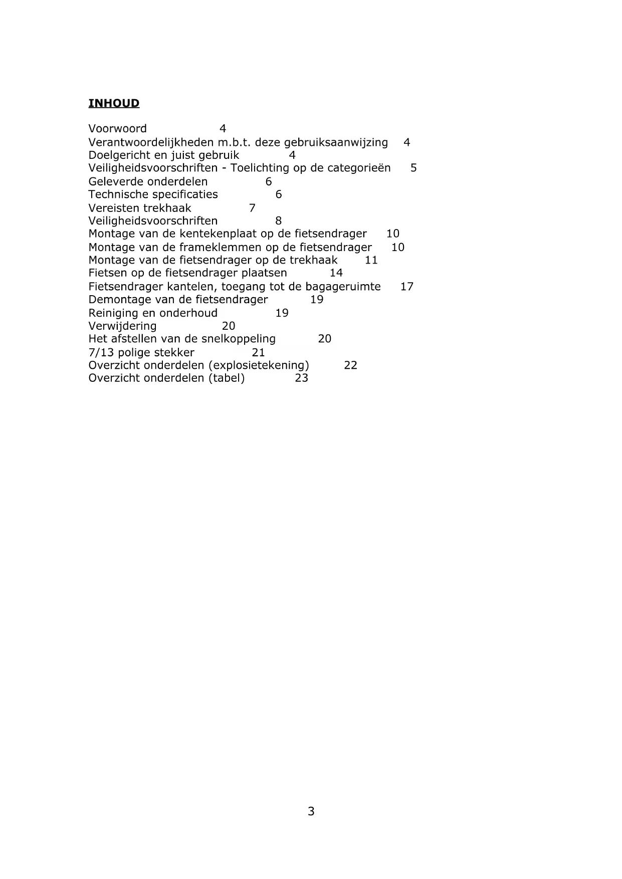 Monteer de fietsendrager alleen op trekhaken, die de volgende eigenschappen bezitten: Materiaal: min. staal of gietijzer St52 of GG52 D-waarde: >7,6 kN Trekhaakbal: Ø50mm (class A-50 volgens EC 94/20 òf ECE R55)8 VEILIGHEIDSVOORSCHRIFTEN Volg nauwkeurig de gebruiksaanwijzing met de daarin staande instructies. Als u de instructies niet opvolgt, kan dit leiden tot lichamelijk letsel of materiële schade. Weet u niet zeker of u de montage van de fietsendrager op een juiste wijze hebt uitgevoerd, vraag dan uw leverancier of de fabrikant om nadere informatie. Noch de fabrikant, of leveranciers zijn aansprakelijk voor schade veroorzaakt die op ondeskundig gebruik of op een ondeskundige montage zijn terug te voeren. Controleer de fietsendrager en de daarbij behorende lading regelmatig! U bent daartoe juridisch verplicht en u wordt in geval van schade aansprakelijk gesteld! ADVIES Bij het rijden met een gemonteerde fietsendrager, zijn de wettelijke vereisten voor het vervoer van goederen achter uw motorvoertuig van toepassing. WAARSCHUWING! Lichamelijk letsel of materiële schade veroorzaakt door een veranderd gedrag van een motorvoertuig. Het rijden met een fietsendrager beïnvloedt de rijeigenschappen van uw motorvoertuig. Pas uw rijsnelheid aan het nieuwe gedrag van het motorvoertuig. Rijd nooit sneller dan 130 km/h. Vermijd plotselinge of trekkende stuurbewegingen. Let erop dat uw motorvoertuig langer is dan normaal. WAARSCHUWING! Lichamelijk letsel of materiële schade veroorzaakt door overbelading. Overschrijding van de maximum belastbaarheid van de fietsendrager, overschrijding van de maximum toegestane kogeldruk van de trekhaak en overschrijding van het maximum toegestane totaal gewicht van uw motorvoertuig kunnen tot ernstige ongevallen leiden. Let op! Houd u onvoorwaardelijk aan de wettelijke vereisten inzake maximum lading, toegestane kogeldruk en toegestaan totaal gewicht van uw motorvoertuig. Overschrijd deze vereisten niet. WAARSCHUWING! Lichamelijk letsel of materiële schade veroorzaakt door niet juist gemonteerde fietsendrager. Het rijden met een gekantelde of ineenvouwen fietsendrager kan tot ongevallen leiden. De beweegbare onderdelen van de fietsendrager zijn in niet volledig gemonteerde positie een bron van gevaar. Haal de fietsendrager van de trekhaak als u die niet nodig heeft. Rijd nooit met een gekantelde of ineenvouwen fietsendrager.9 WAARSCHUWING! Lichamelijk letsel of materiële schade veroorzaakt door het verlies van fietsen. Het rijden zonder spanbanden kan leiden tot ongelukken. Controleer voor het begin van iedere rit de goede staat en stevigheid van de spanband om de fietsframes en de framehouders van de fietsendrager (zie stap 8 hoofdstuk “Fietsen op de fietsendrager plaatsen”). Controleer voor het begin van iedere rit de goede staat en stevigheid van de beide spanbanden om het voor- en achterwiel van de fiets(en). Trek de spanbanden eventueel na. Controleer voor het begin van iedere rit, of de gebruikte spanbanden onbeschadigd en niet versleten zijn. Beschadigde of versleten spanbanden moeten voor het begin van de rit worden vervangen voor onbeschadigde spanbanden. Alleen spanbanden die door Tradekar Benelux BV zijn toegestaan, mogen worden gebruikt. WAARSCHUWING! Lichamelijk letsel of materiële schade veroorzaakt door overhangende onderdelen. Over het uiteinde van het motorvoertuig dan wel over het uiteinde van de fietsendrager hangende onderdelen kunnen tijdens het rijden lichamelijk letsel of materiële schade veroorzaken. Monteer alleen onderdelen die niet over het uiteinde van het voertuig uitsteken. WAARSCHUWING! Lichamelijk letsel of materiële schade veroorzaakt door dekzeilen. Dekzeilen verhogen de luchtweerstand. Zij kunnen losraken en rondvliegen, wat tot ernstige ongevallen kan leiden. Gebruik geen dekzeilen of andere soorten afdekking. WAARSCHUWING! Lichamelijk letsel of materiële schade veroorzaakt door het verlies van de fietsendrager. De fietsendrager gaat na bevestiging en na een paar gereden kilometers pas echt goed vastzitten op de trekhaak. Controleer na een paar kilometer de bevestiging van de fietsendrager op het goed vastzitten op de trekhaak. Zet de fietsendrager opnieuw vast indien deze (te) los op de trekhaak zit. WAARSCHUWING! Lichamelijk letsel of materiële schade veroorzaakt door het afbreken van de fietsendrager. Door met de fietsendrager in ruw terrein te rijden kan deze afbreken. Gebruik de fietsendrager niet in ruw terrein. Alleen geschikt voor gebruik op een personenauto trekhaak. Rijd langzaam over verkeersdrempels: max. snelheid 10km/h.10 LET OP! Materiële schade veroorzaakt door het openen van de achterklep of kofferdeksel. De achterklep of kofferdeksel kunnen beschadigd worden als zij in aanraking komen met de op de trekhaak aangebrachte fietsendrager. De elektrisch bedienbare achterklep uitschakelen en deze met de hand bedienen. Kantel de fietsendrager weg voordat de achterklep of kofferdeksel wordt geopend. LET OP! Materiële schade veroorzaakt door hete uitlaatgassen. Als het uiteinde van de uitlaat zich in de buurt van de fietsendrager of fietsen bevindt, kunnen deze hierdoor worden beschadigd. Gebruik indien nodig een uitlaatsierstuk met bocht. MONTAGE VAN DE KENTEKENPLAAT OP DE FIETSENDRAGER