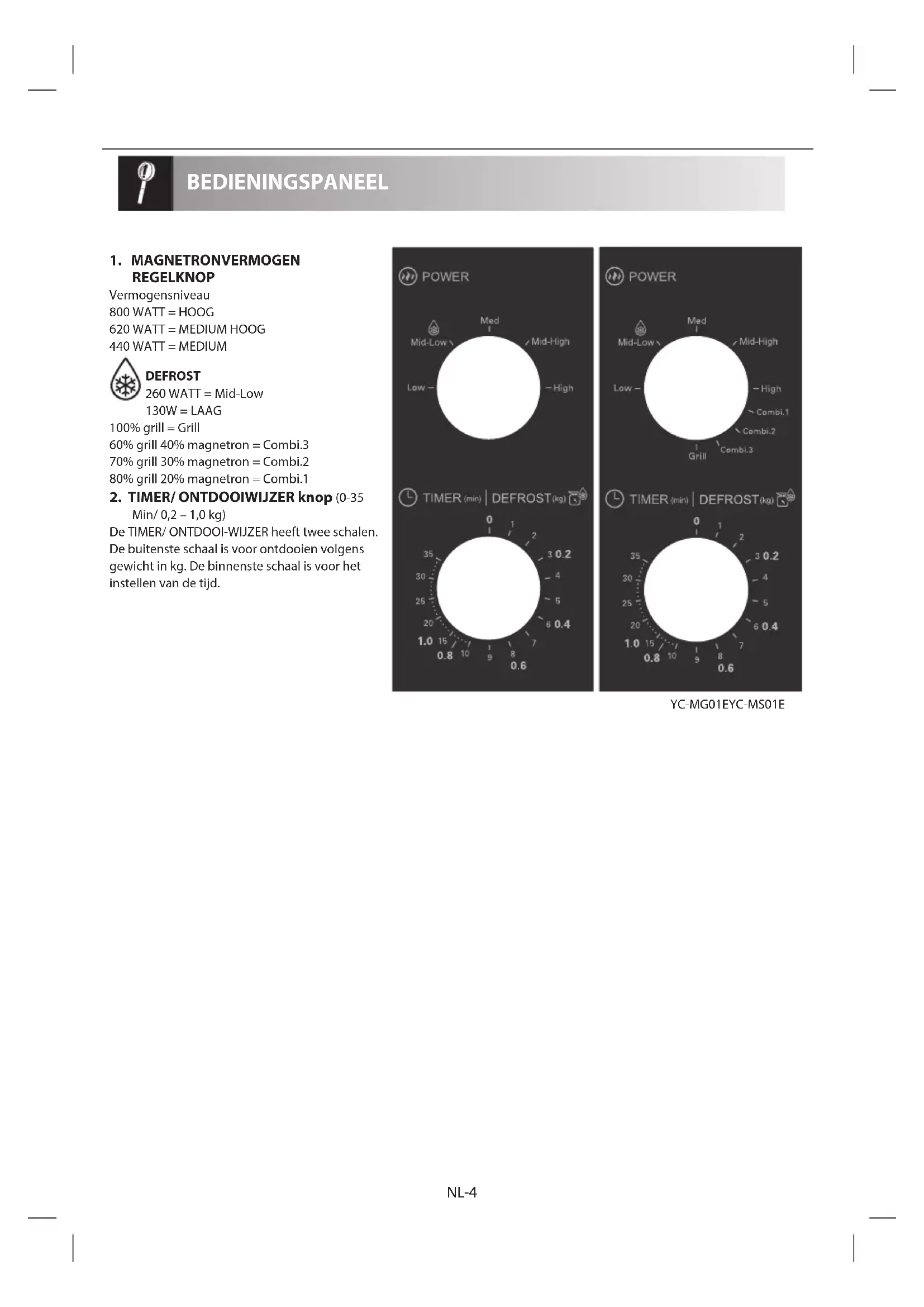 4. Wanneer het opwarmen/ontdooien afgelopen is, gaat de TIMER/ONTDOOI-WIJZER terug naar “0” nul en