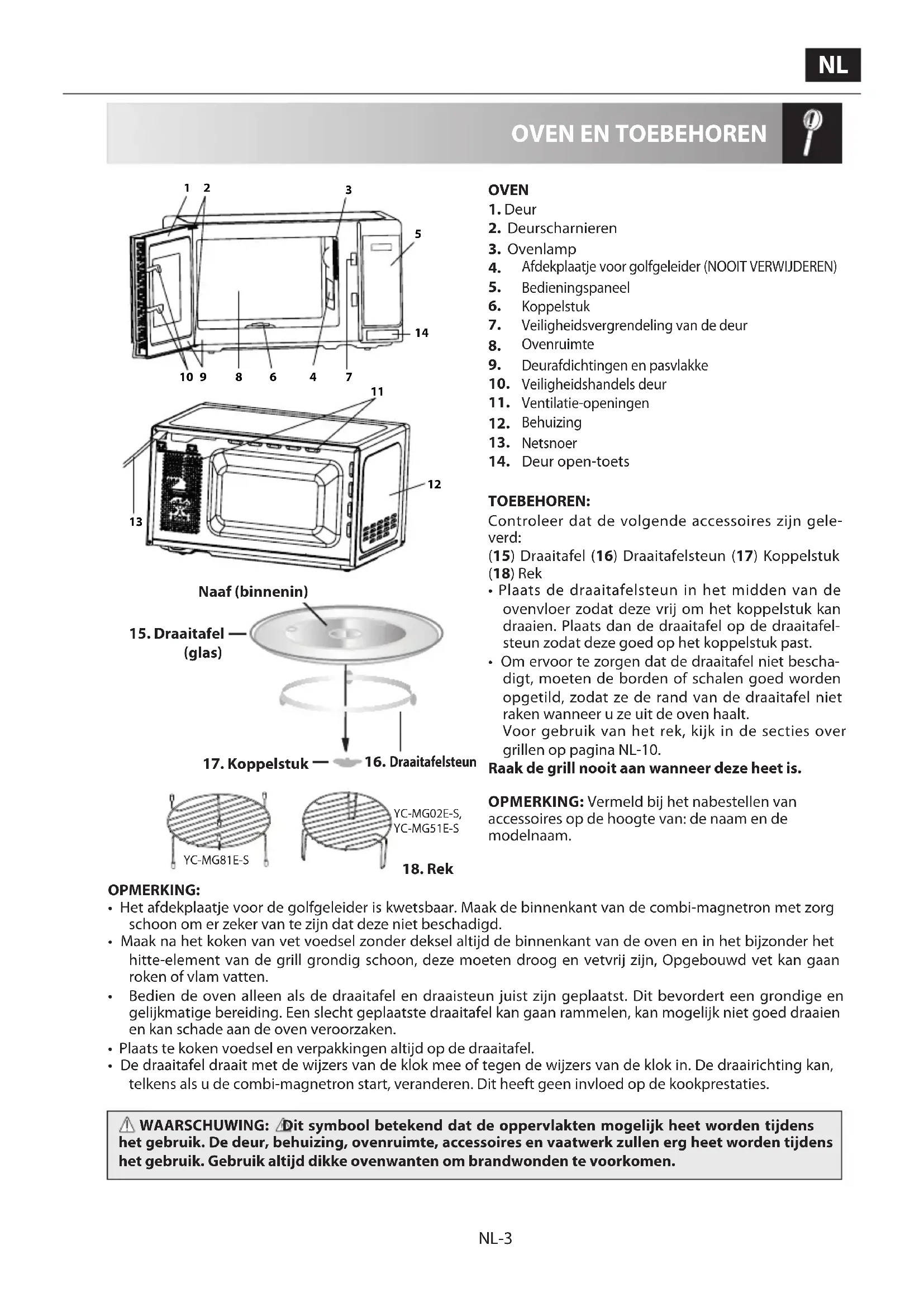 - in een bed-and-breakfast. Deze magnetron dient voor het bereiden van voedsel thuis en dient derhalve alleen voor het bereiden van voedsel te worden gebruikt. Gebruik de magnetron niet voor commer- ciële doeleinden of in een laboratorium. Voorkomen van problemen of beschadiging. Gebruik de magnetron nooit wanneer deze leeg is. Ter voor- komen van beschadiging van de draaitafel en steun door oververhitting dient u bij gebruik van bruineringsschalen of zelf-verwarmende materialen altijd een hittebestendig isolatiemateriaal zoals een porseleinen bord, onder de schaal of het materiaal te plaatsen. Overschrijd nooit de in de hand- leiding van het vaatwerk voorgeschreven opwarmtijd. NL-13NL-13NL-14 BELANGRIJKE VEILIGHEIDSMAATREGELEN Gebruik geen metalen voorwerpen. Mikrogolven reflecte- ren hier namelijk op waardoor vonken kunnen ontstaan. Plaats geen blikjes in de magnetron. Gebruik alleen de voor deze magnetron ontworpen draai- tafel en draaitafelsteun. Gebruik de magnetron niet zonder de draaitafel. Om te voorkomen dat de draaitafel breekt: (a) Laat de draaitafel afkoelen alvorens deze met water te reinigen. (b) Plaats heet voedsel of hete schalen en dergelijke niet op een koude draaitafel. (c) Plaats koud voedsel of koude schalen en dergelijke niet op een warme draaitafel. Plaats tijdens gebruik geen voorwerpen op de behuizing van de magnetron. NL-14NL-14NL NL-15 NEDERLANDS BELANGRIJKE VEILIGHEIDSMAATREGELEN OPMERKING: Gebruik geen plastic verpakkingen bij het opwarmen met de magnetronfunctie indien de magnetron nog steeds heet is van het gebruik van de GRILL en MIX GRILL-functie, om- dat deze dan kunnen smelten. Plastic bakjes en verpakkingen kunnen niet met de hierbo- ven genoemde functie worden gebruikt tenzij het bakje of verpakking door de fabrikant als geschikt zijn gemerkt. Raadpleeg een erkend elektricien indien u twijfels heeft over het aansluiten van uw magnetron. Noch de fabrikant noch de dealer zijn aansprakelijk voor schade aan de magnetron of letsel indien de magnetron niet op de voorgeschreven, juiste manier is aangesloten. Condens of vocht kunnen zich mogelijk op de magnetron- wanden of rond de deurafdichtingen en pasvlakken vor- men. Dit is normaal en duidt niet op een defect of lekkage. NL-15NL-15 Dit symbool betekent dat de oppervlakken tijdens het gebruik warm kunnen worden.NL-16 INSTALLATIE