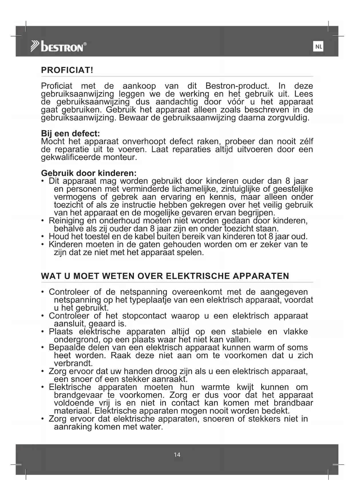 FRPROFICIAT! Proficiat met de aankoop van dit Bestron-product. In deze gebruiksaanwijzing leggen we de werking en het gebruik uit. Lees de gebruiksaanwijzing dus aandachtig door vóór u het apparaat gaat gebruiken. Gebruik het apparaat alleen zoals beschreven in de gebruiksaanwijzing. Bewaar de gebruiksaanwijzing daarna zorgvuldig. Bij een defect: Mocht het apparaat onverhoopt defect raken, probeer dan nooit zélf de reparatie uit te voeren. Laat reparaties altijd uitvoeren door een gekwalificeerde monteur. Gebruik door kinderen: