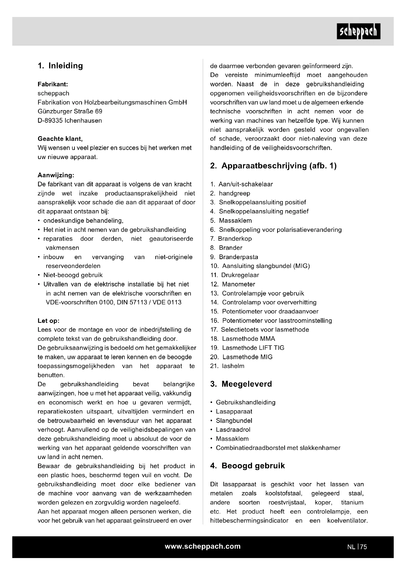 Fabrikant: scheppach Fabrikation von Holzbearbeitungsmaschinen GmbH Günzburger Straße 69 D-89335 Ichenhausen Geachte klant, Wij wensen u veel plezier en succes bij het werken met uw nieuwe apparaat. Aanwijzing: De fabrikant van dit apparaat is volgens de van kracht zijnde wet inzake productaansprakelijkheid niet aansprakelijk voor schade die aan dit apparaat of door dit apparaat ontstaan bij: